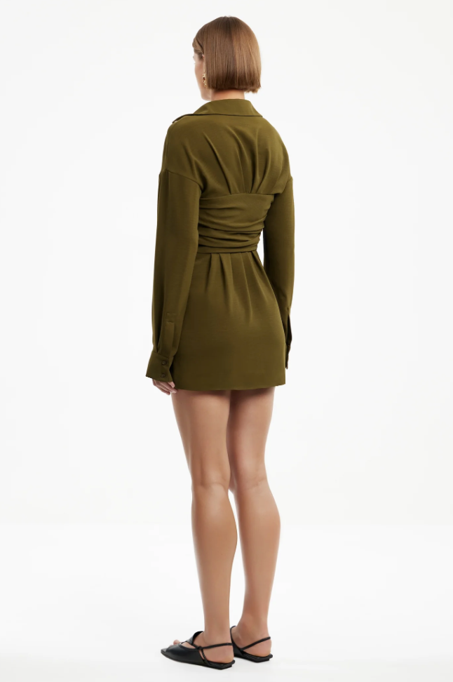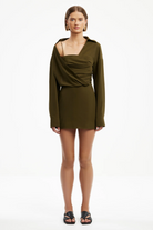 The Solenne Long Sleeve Mini Dress in Khaki makes an effortless statement. Featuring a softly draped neckline, tailored long sleeves and a fitted mini skirt, this style transitions seamlessly from day to night with just a change of shoes and accessories.