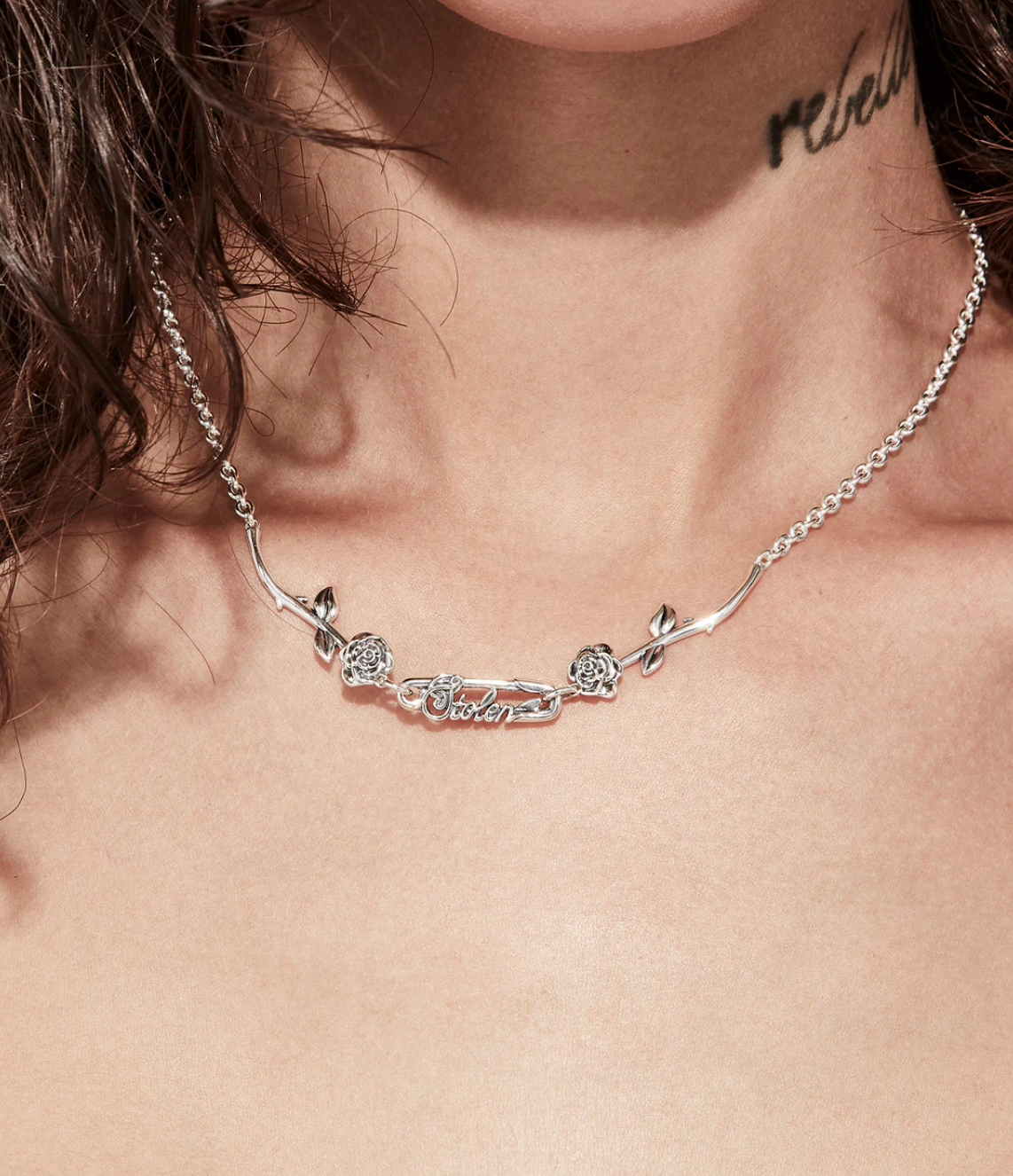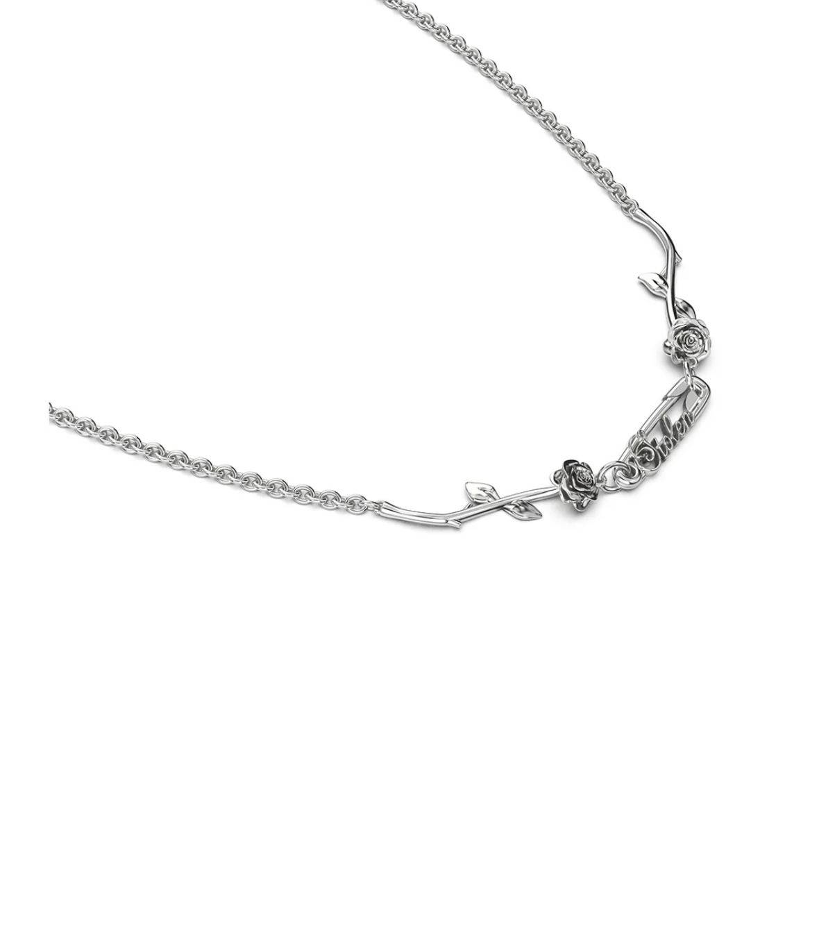 The Rose Pin Necklace is crafted in solid sterling silver, bringing together sculpted rose forms and a refined pin silhouette. Delicate stems and polished contours frame the piece with precision, balancing romance with a considered edge. Designed to sit elegantly at the collarbone, it moves effortlessly between everyday wear and evening styling. A limited‑edition Valentine’s capsule piece.