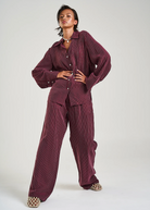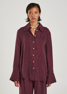 The Kina Pinstripe Cuff Shirt offers a silky lightweight design with a structured collar and flared oversized cuffed sleeve.