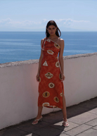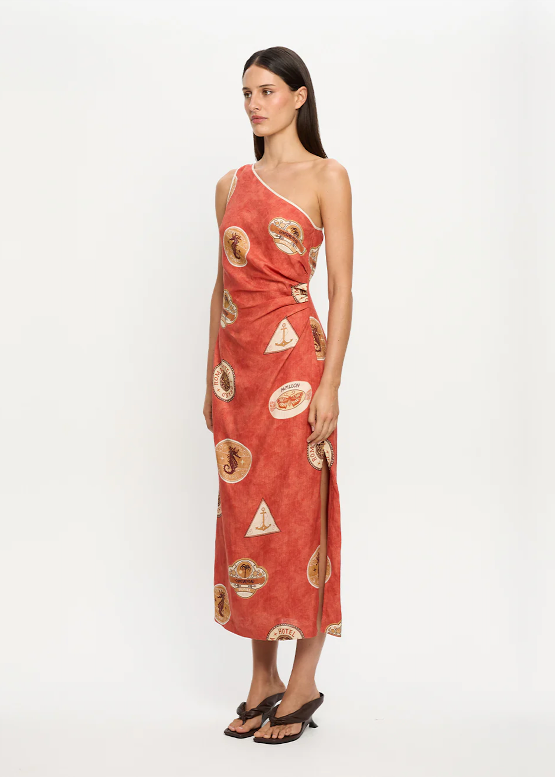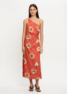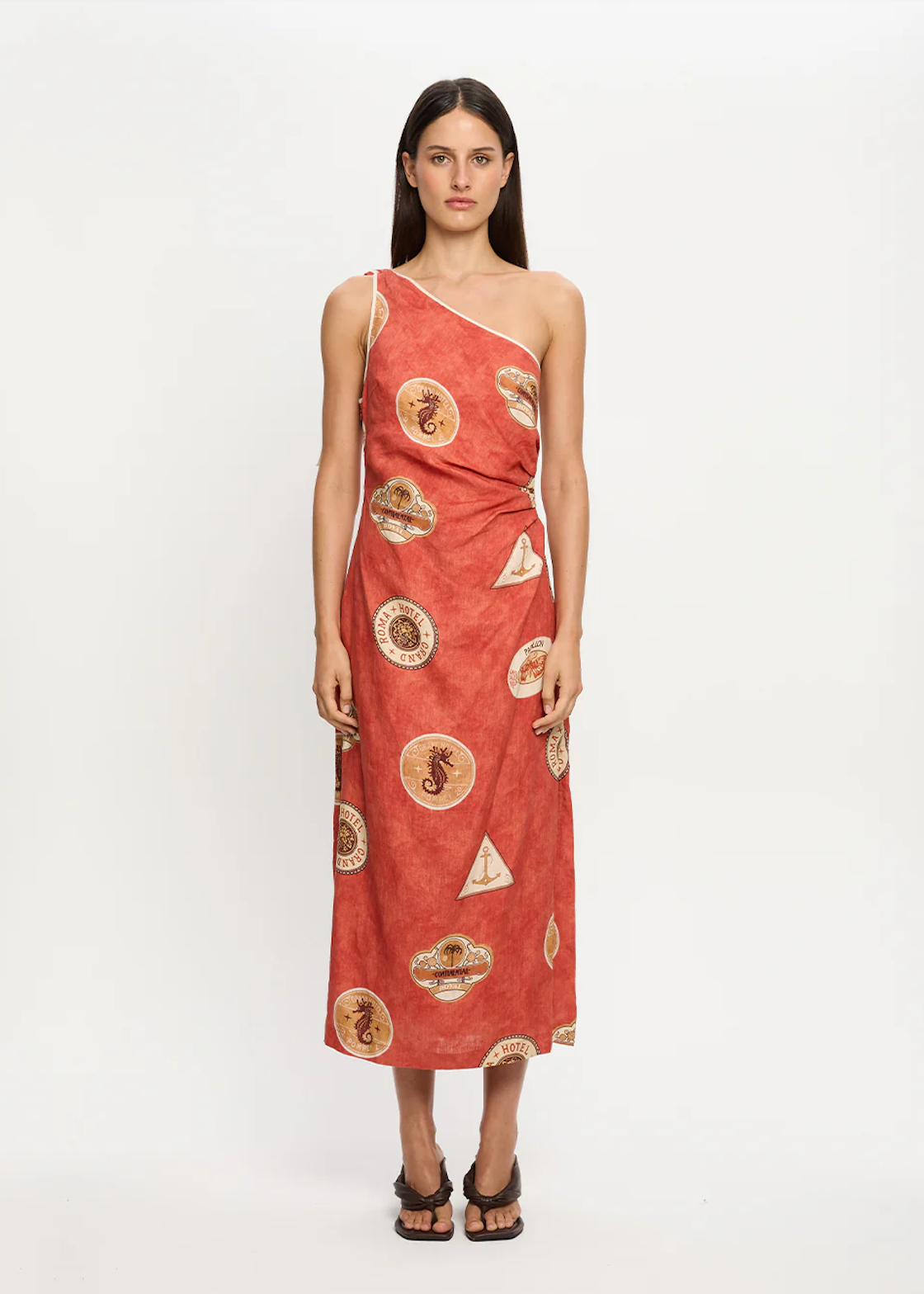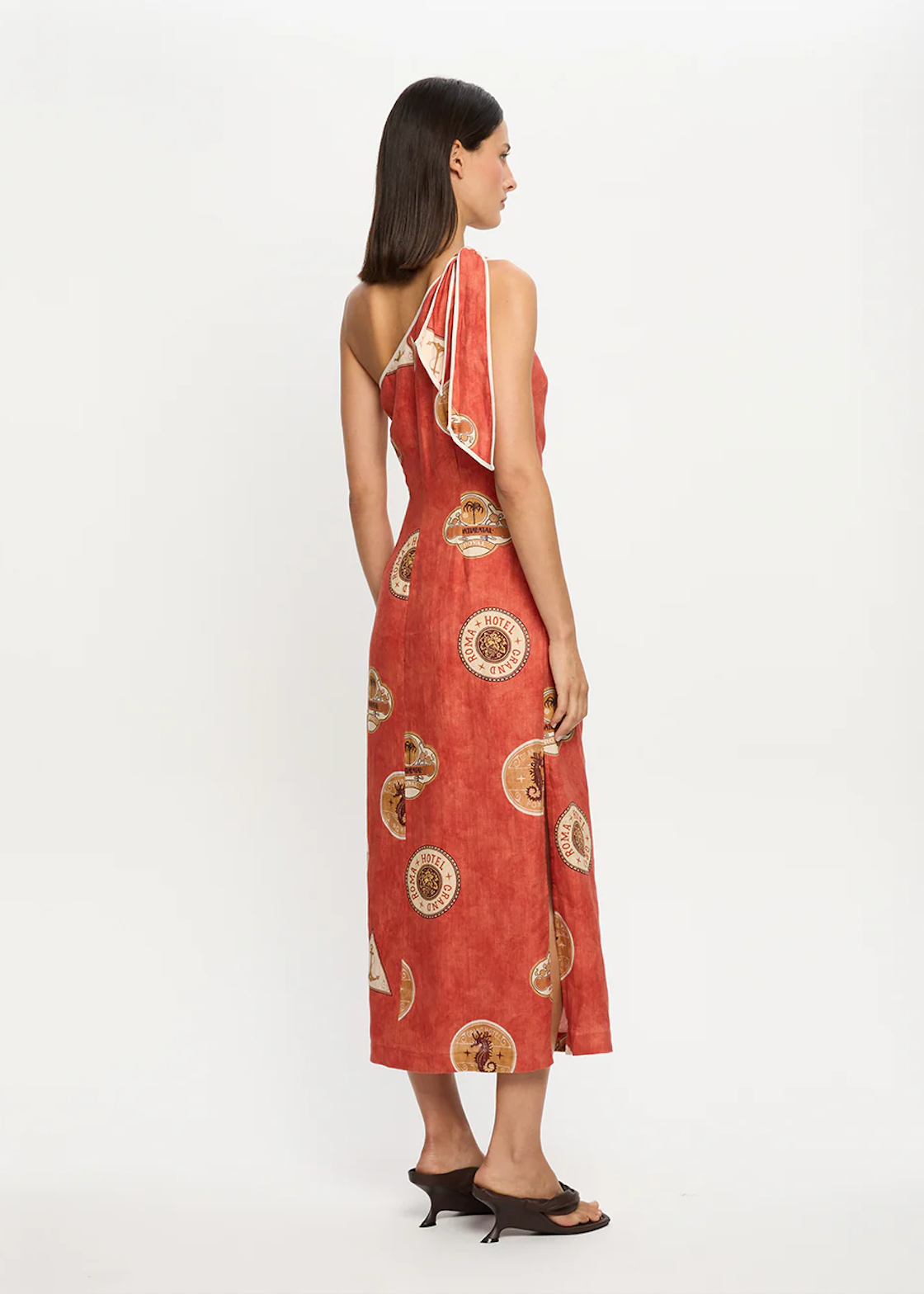 Vacanza is vintage motifs set against a rich, warm red base. The Vacant Midi Dress features an asymmetrical neckline with adjustable tie, complete with a flared hem.