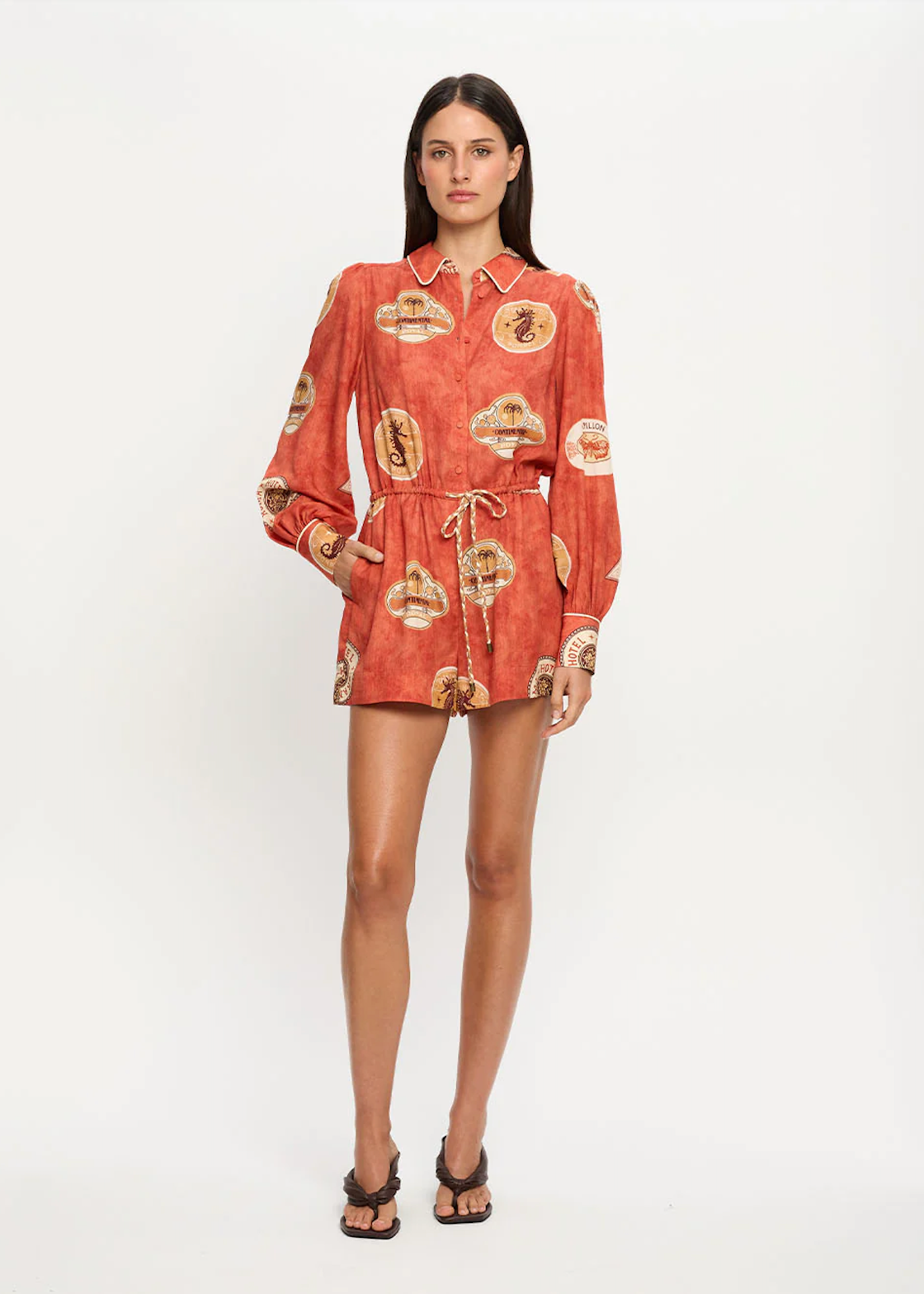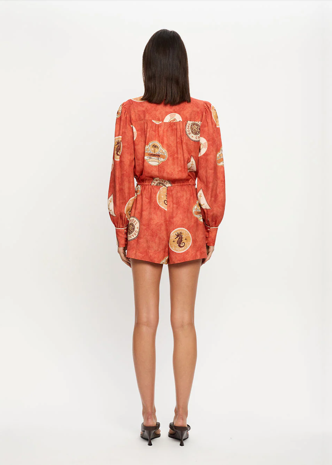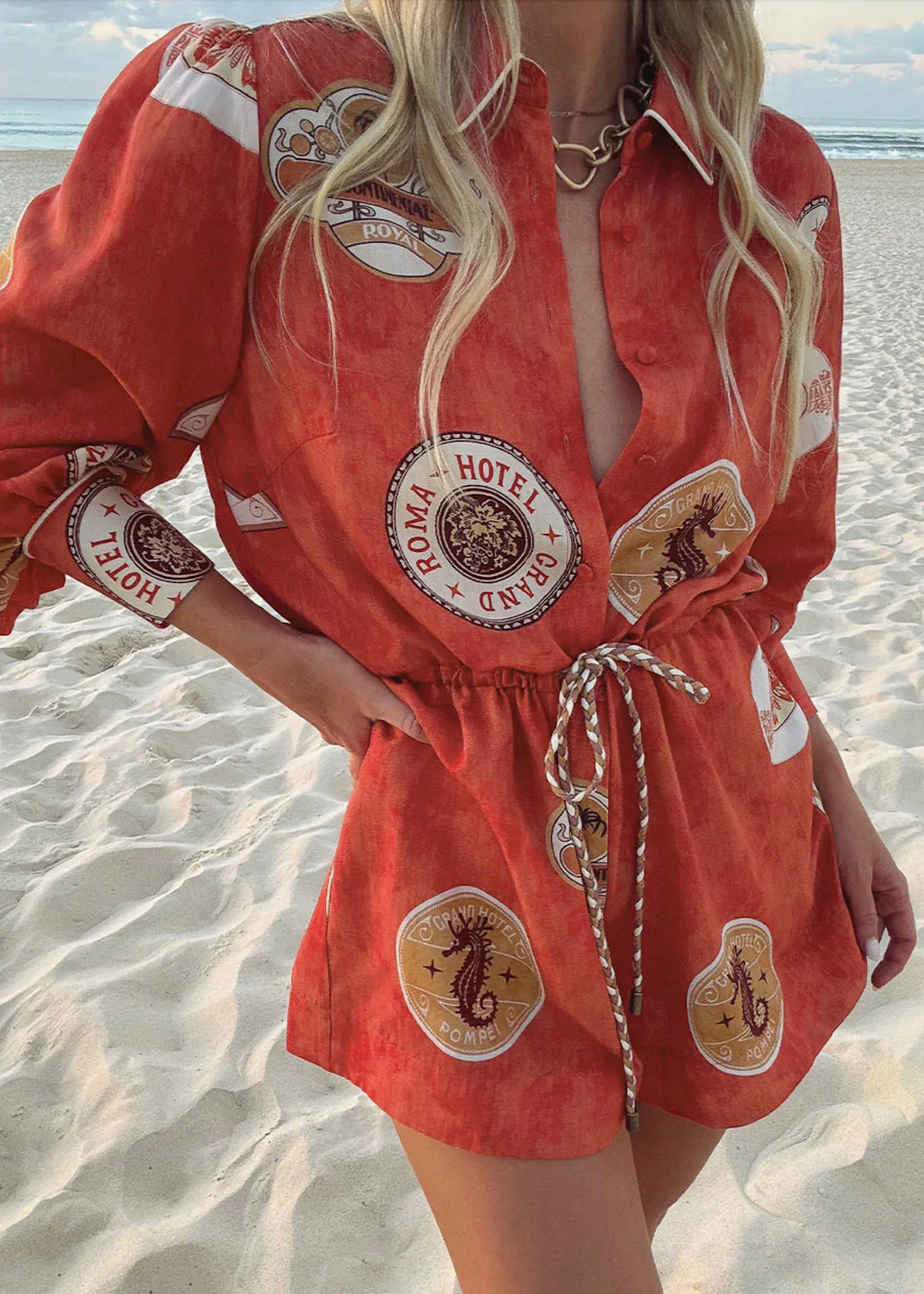 Vacanza is vintage motifs set against a rich, warm red base. The Vacanza Playsuit is a relaxed silhouette featuring a button down front, full length blouson sleeves, complete with a waist tie