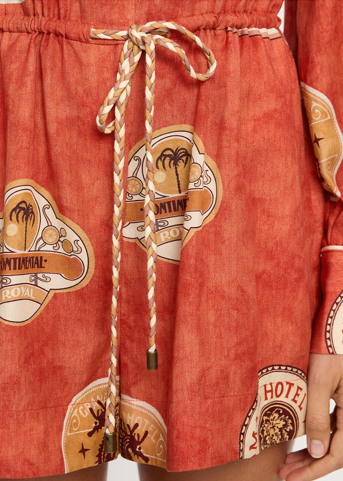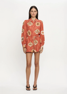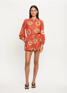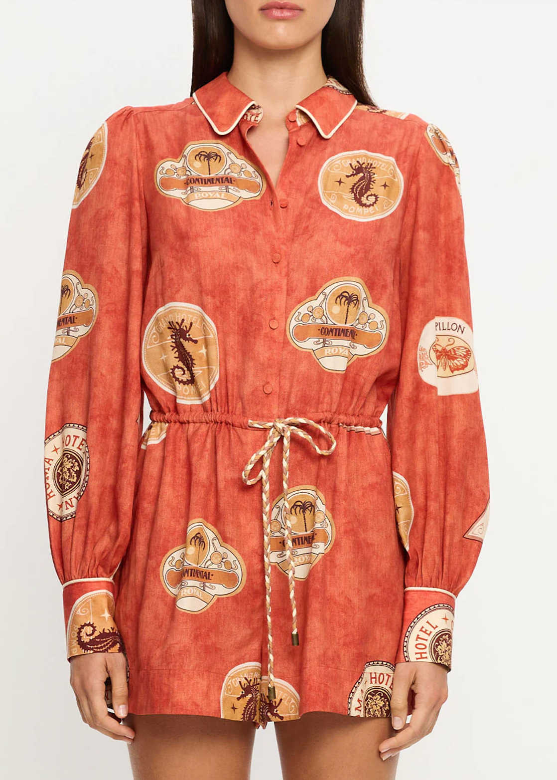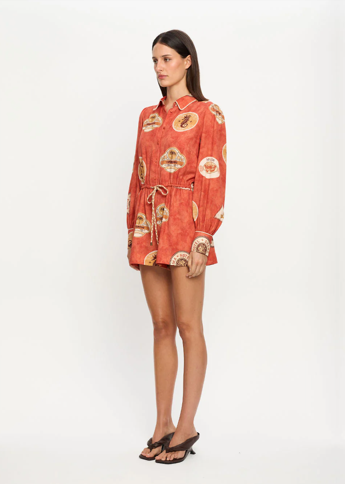 Vacanza is vintage motifs set against a rich, warm red base. The Vacanza Playsuit is a relaxed silhouette featuring a button down front, full length blouson sleeves, complete with a waist tie
