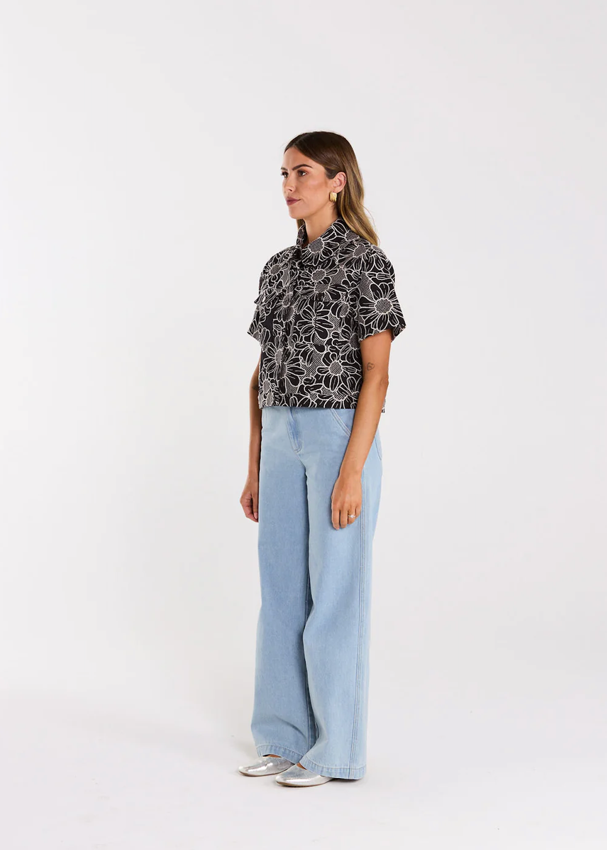 The Zephrya Top is a short-sleeve, denim-inspired piece with a rounded collar and front patch pockets. Wear it buttoned up for a polished look or open for effortless ease.