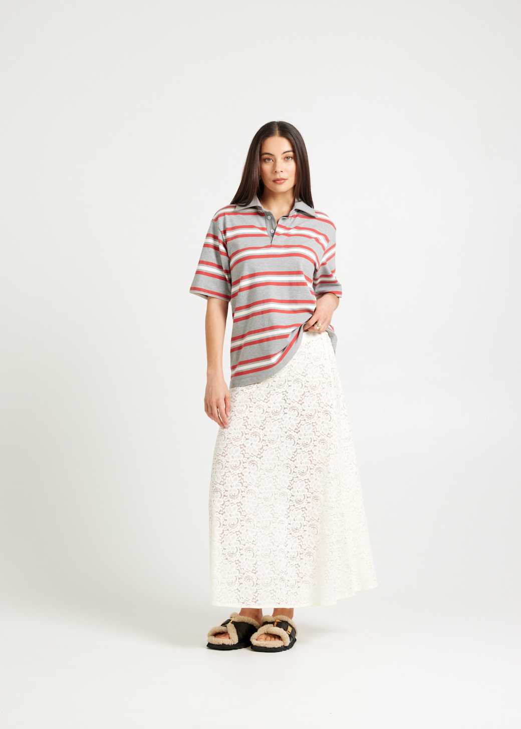 The lace skirt you’ve been waiting for. This one looks good, fits great, and is the nicest lace fabric we’ve come across – and we know lace! Wear with a long/oversize shirt, tee, knit, or blazer to cover the hips if preferred. Team with the matching Bonnie Top for a stunning dress alternative.