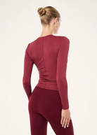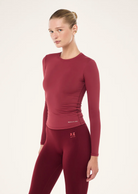 The Foundation Long Sleeve Top in Cabernet is cut from our Body Luxe fabrication, offering smooth support with a refined, body-contouring feel. Built for Pilates, light training and transitional layering, it moves seamlessly through the day. Designed in a slim silhouette with a clean crew neckline and subtle front hem branding, it delivers understated performance with elevated edge. Wear it with the Restore Seamless Legging for effortless studio-to-street dressing.