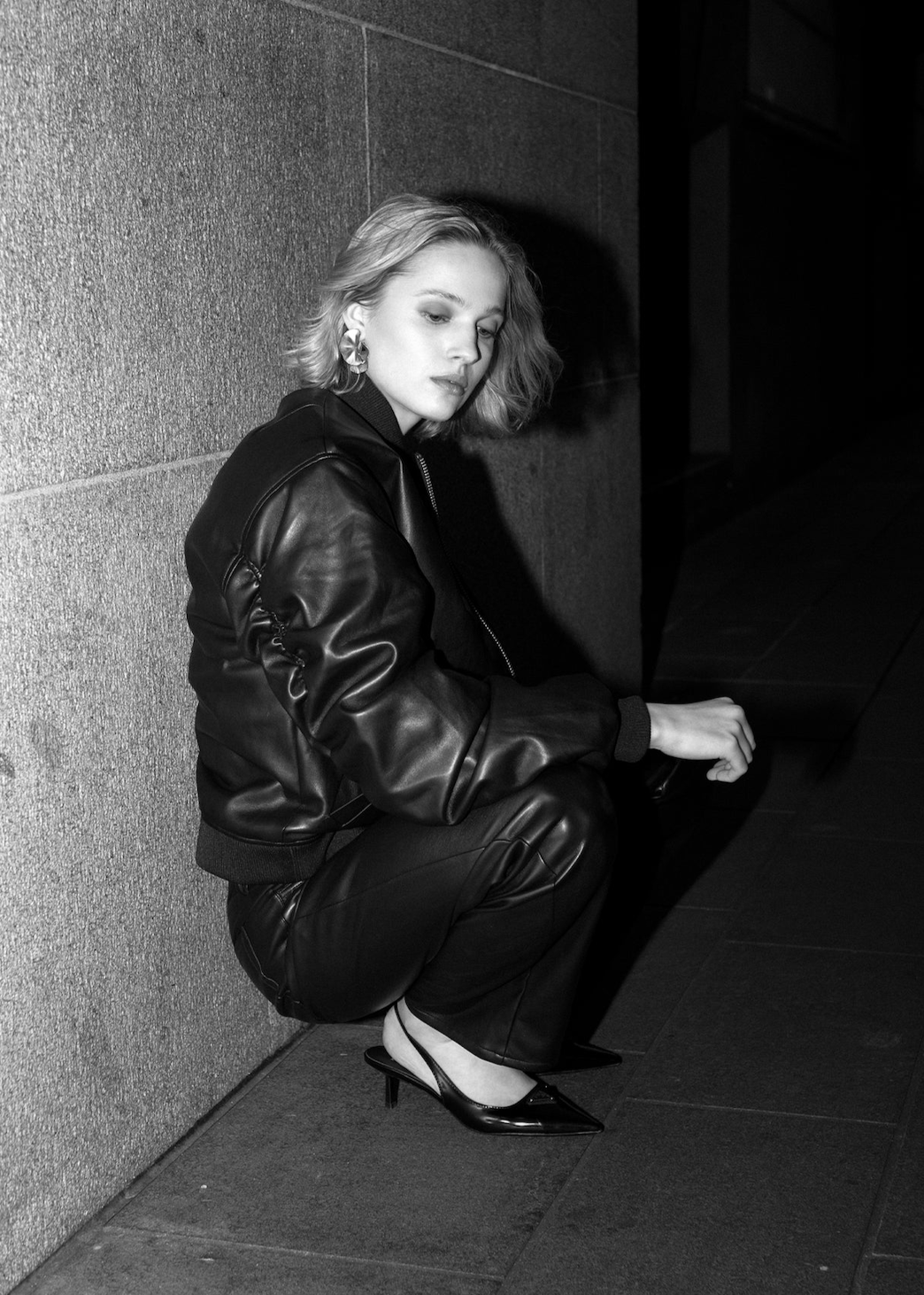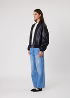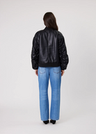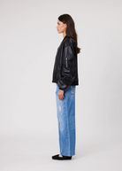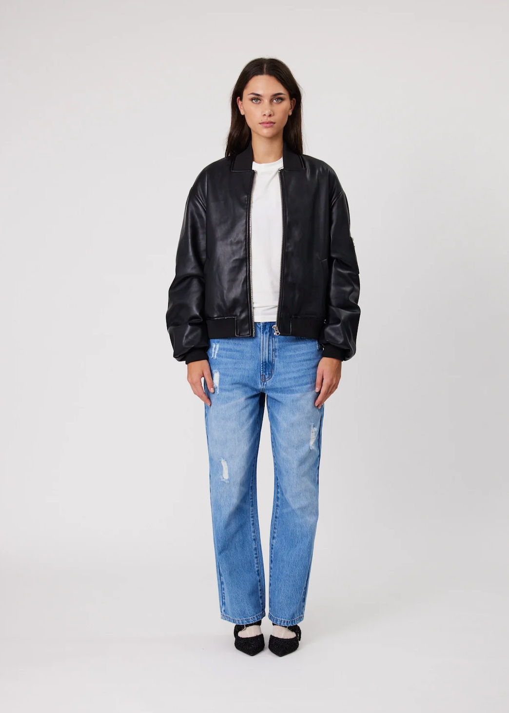 Add a bold and sleek edge to your wardrobe with the Presley Bomber Jacket. Made from a soft faux leather and designed for a relaxed fit. The perfect transeasonal layering piece.