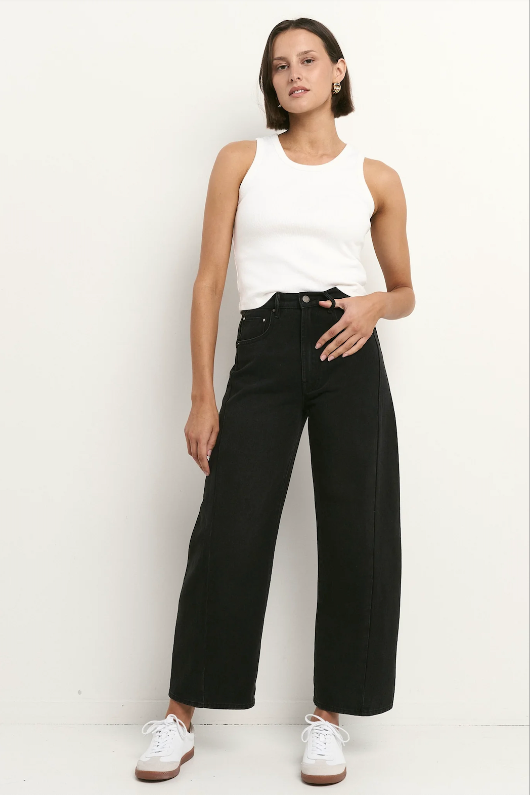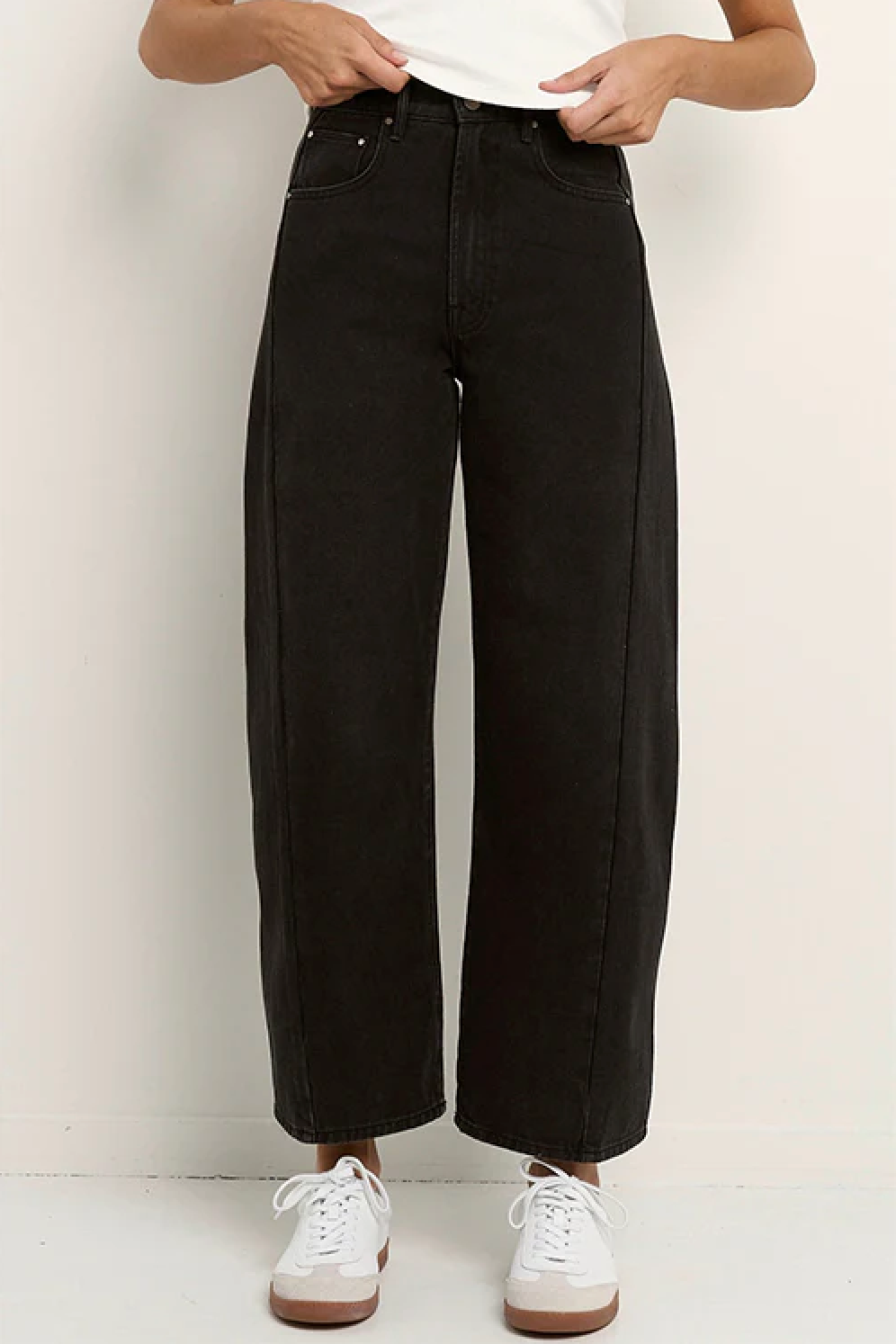 The much anticipated Varsity Black Wash Jean is your go-to for cool, confident dressing with a polished twist. Cut in a flattering mid rise with a barrel leg, gentle tapering to the ankle and slightly cropped length, these jeans are the epitome of relaxed chic. Crafted in washed black denim that gets better with age, they’re made to pair effortlessly with everything from tanks and tees to blazers and boots.
