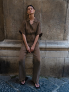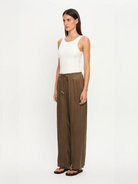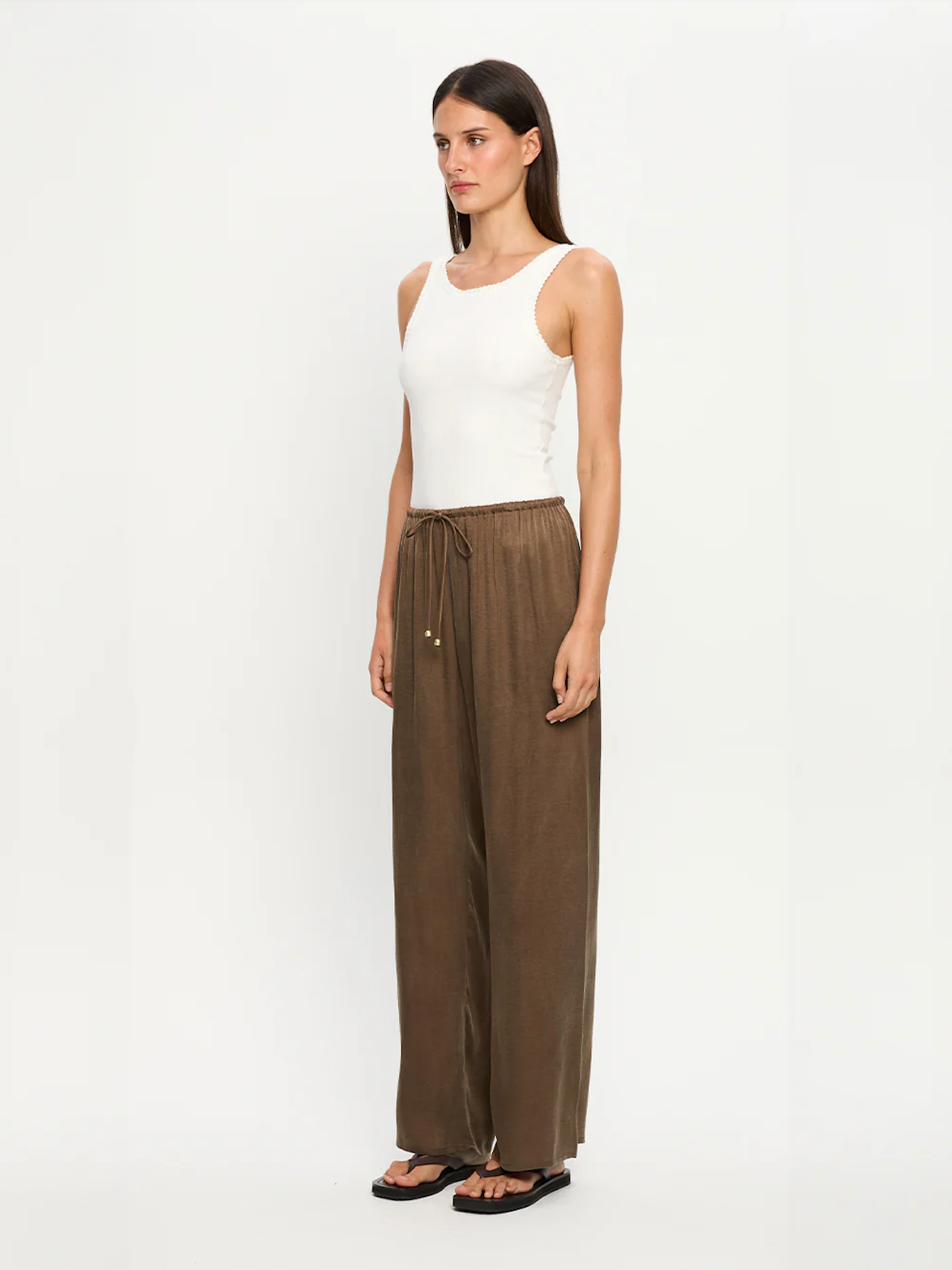 The Jaxon Pant in mocha is a relaxed straight leg pant featuring an elasticated waistband complete with a drawcord