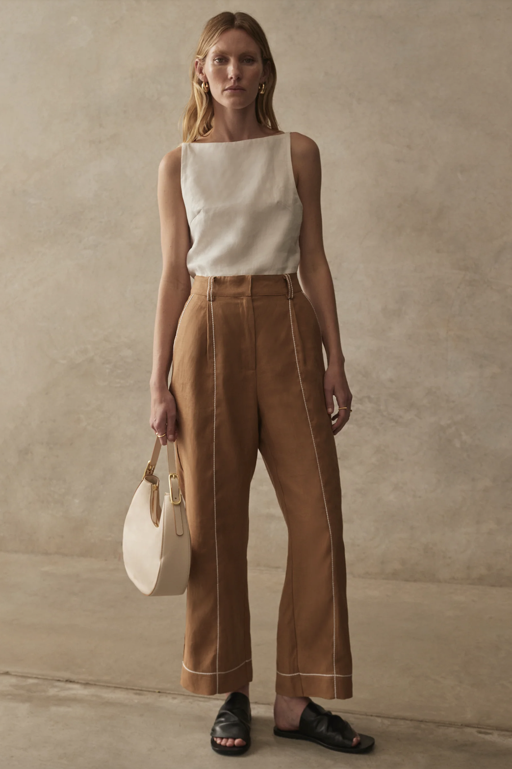Introducing a new classic tailored style to add to your wardrobe; the Avalon pants are a traditional cut with an extra point of interest. The thick vatical contrast stitch is the perfect detail to spice up a simple outfit. Style with our new Tanzin belt
