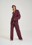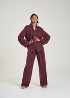 The Kina Pinstripe Boss pant is a relaxed suit pant crafted from a luxuriously soft cupro and viscose blend, designed with pleated darts, practical pockets, and a belt band for added versatility