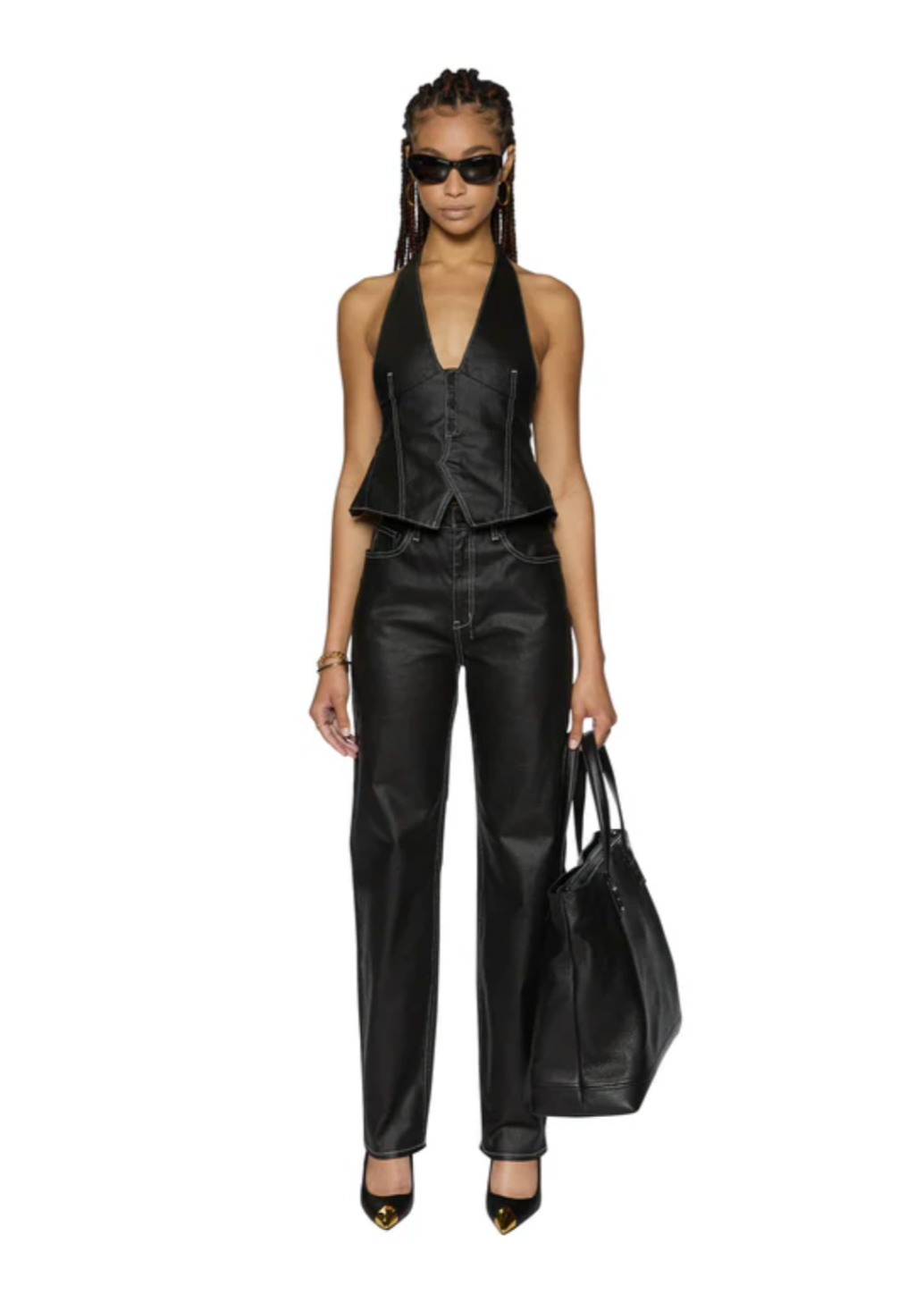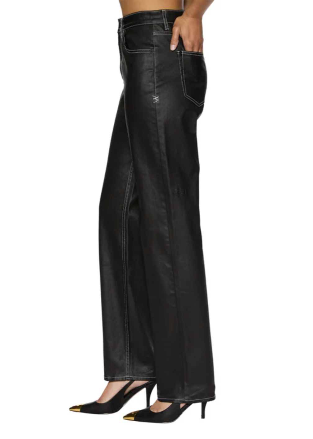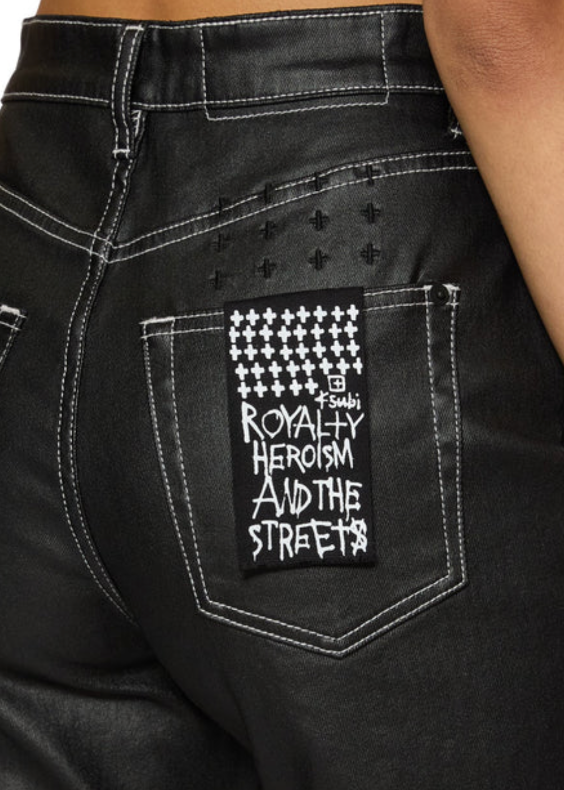 The Playback Slicker is a relaxed tapered, full-length jean with a super high rise. Made from premium rigid waxed denim in black with contrast stitching, it features classic five-pocket styling, matte black Ksubi branded hardware, T-box and 3x4 embroidery. Pair it with the Valentina Halter Top Slicker for an elevated party look