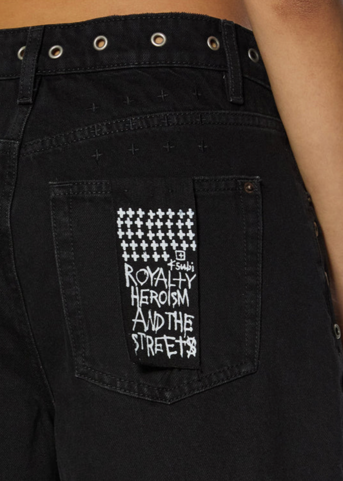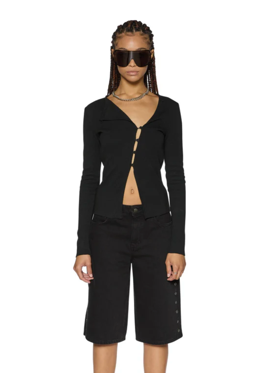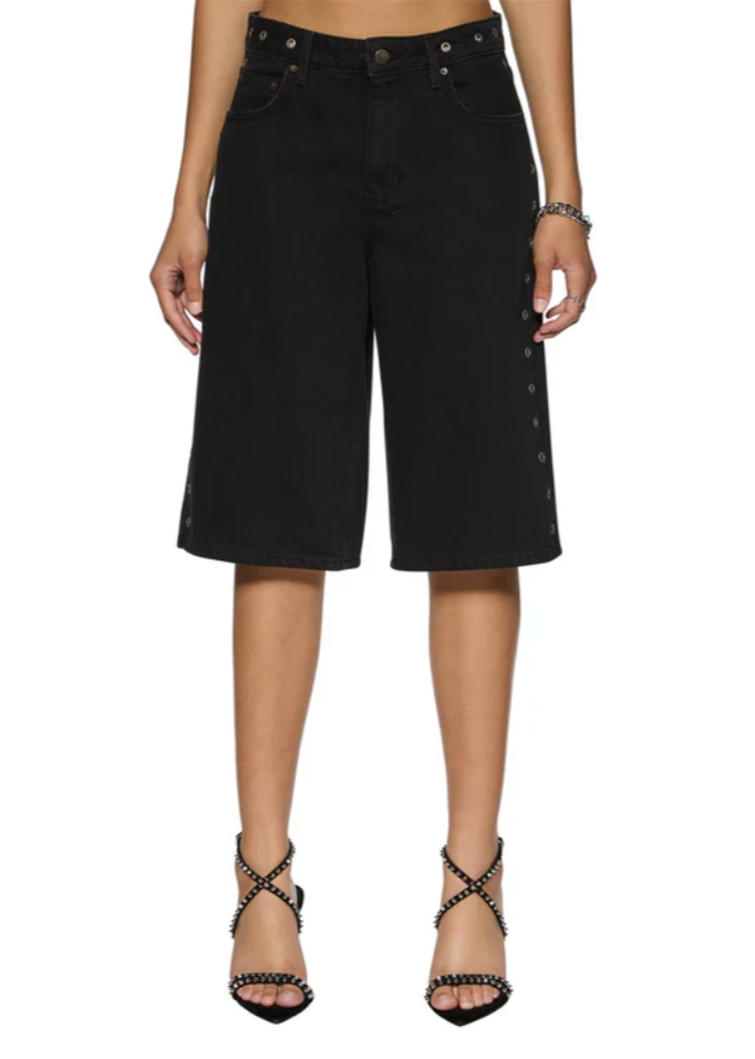 The Low Rider Short in Vice is a low-rise, longer-length denim short designed to finish just below the knee. Made from premium European rigid denim in lightly washed black, it features silver eyelet details around the waistband and down the side seams, along with classic Ksubi branded hardware and T-box and 3x4 embroidery branding. Style it back with the Sydicate Cropped Rework Tank in White for an effortless off-duty look