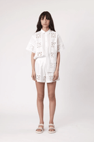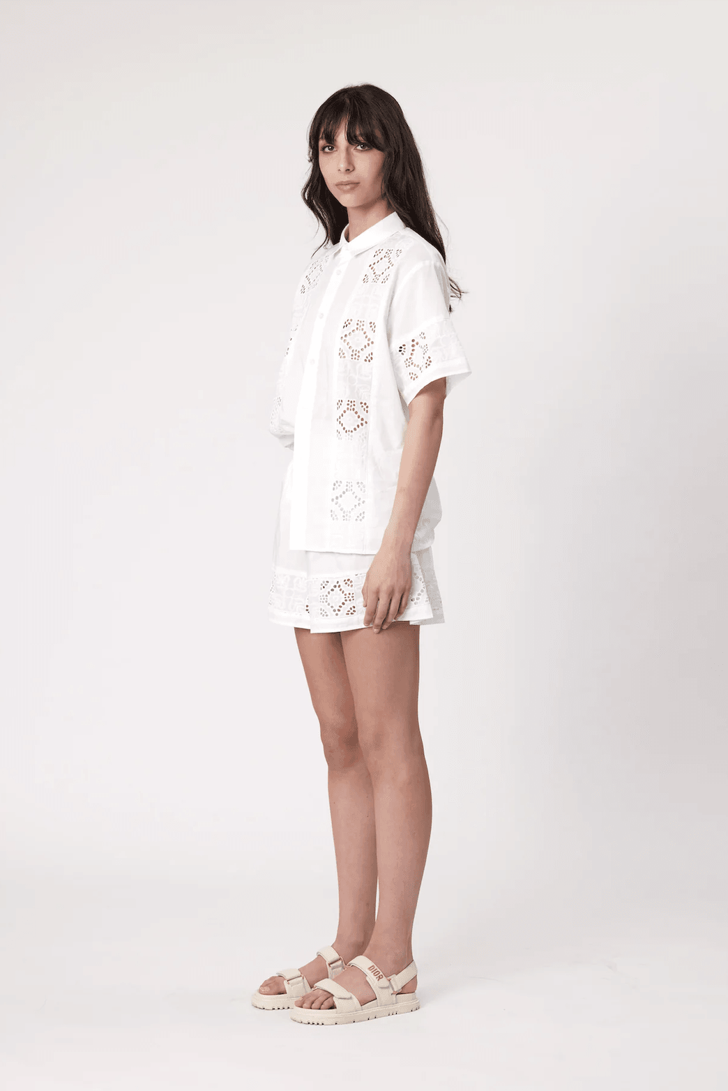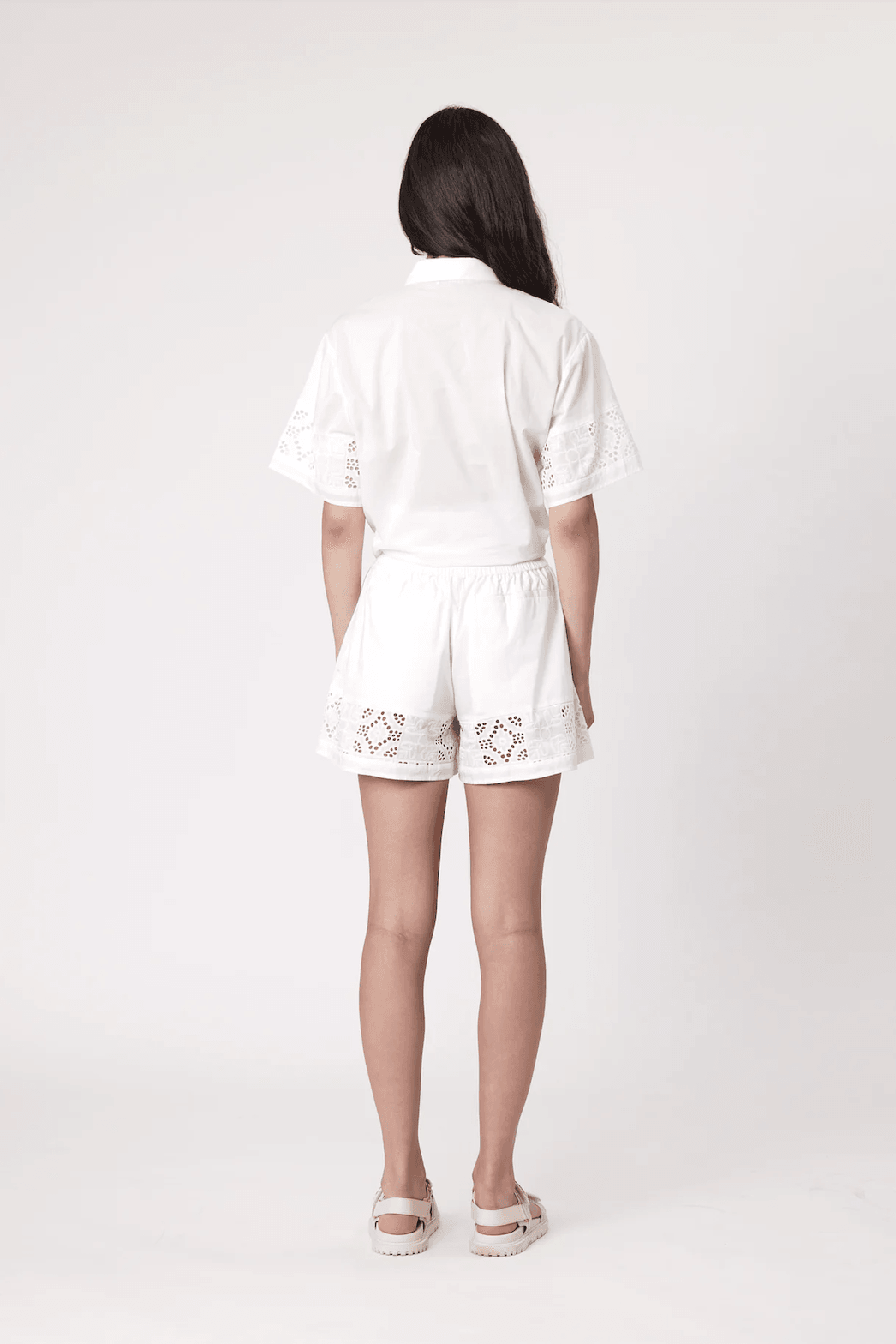 The Elsa Shorts is constructed with broderie panels at the hem for a feminine touch. Made from 100% cotton poplin, light, breathable and fit for lounging, or paired with the elsa shirt for an effortless co-ord look.