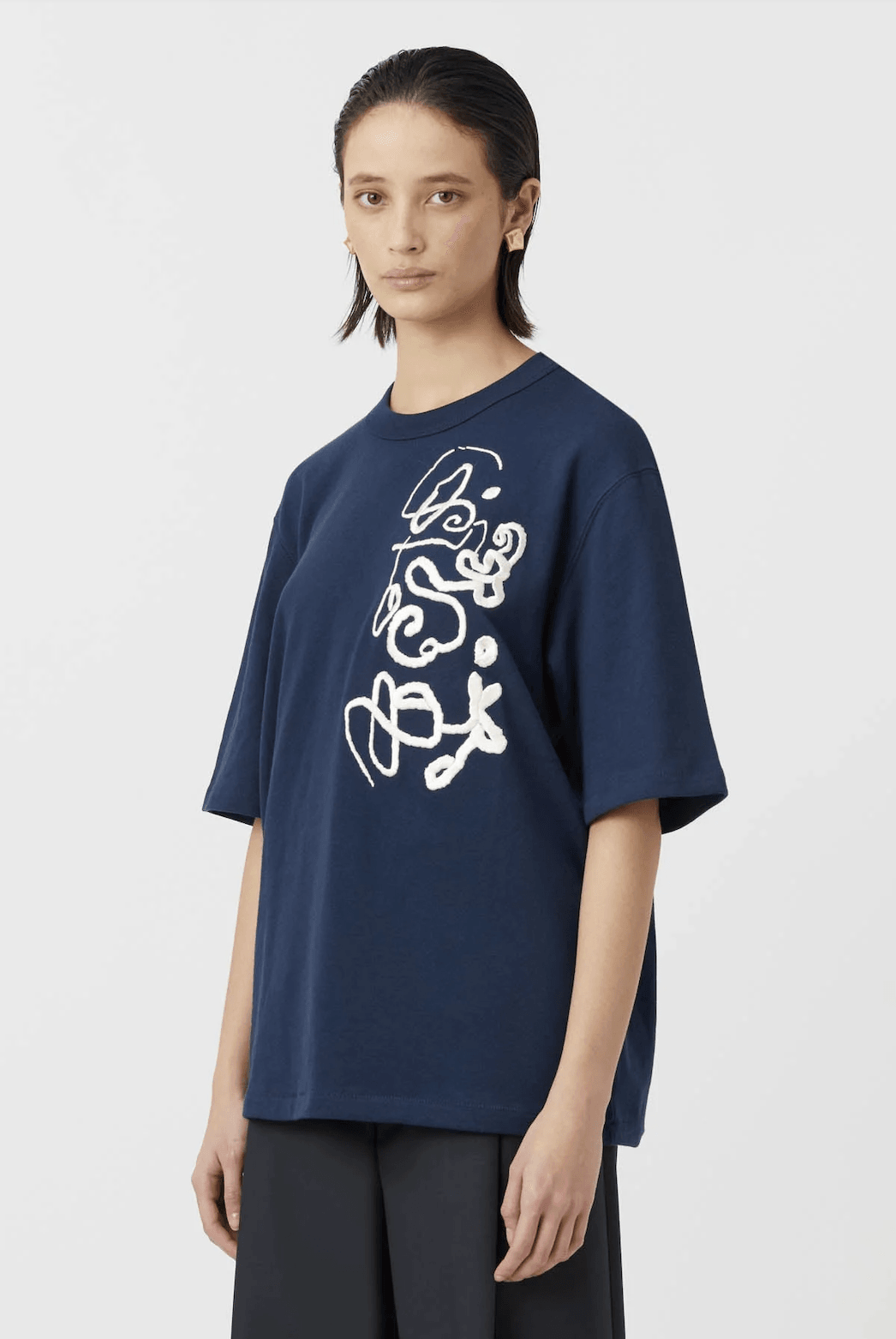 The Briony Tee redefines casual comfort with its oversized silhouette and lightweight fleece, perfect for effortless everyday wear. Featuring a striking contrast embroidery graphic motif on the left chest, this tee adds a touch of flair to any ensemble.
