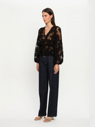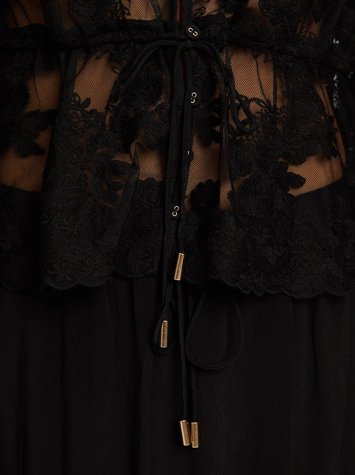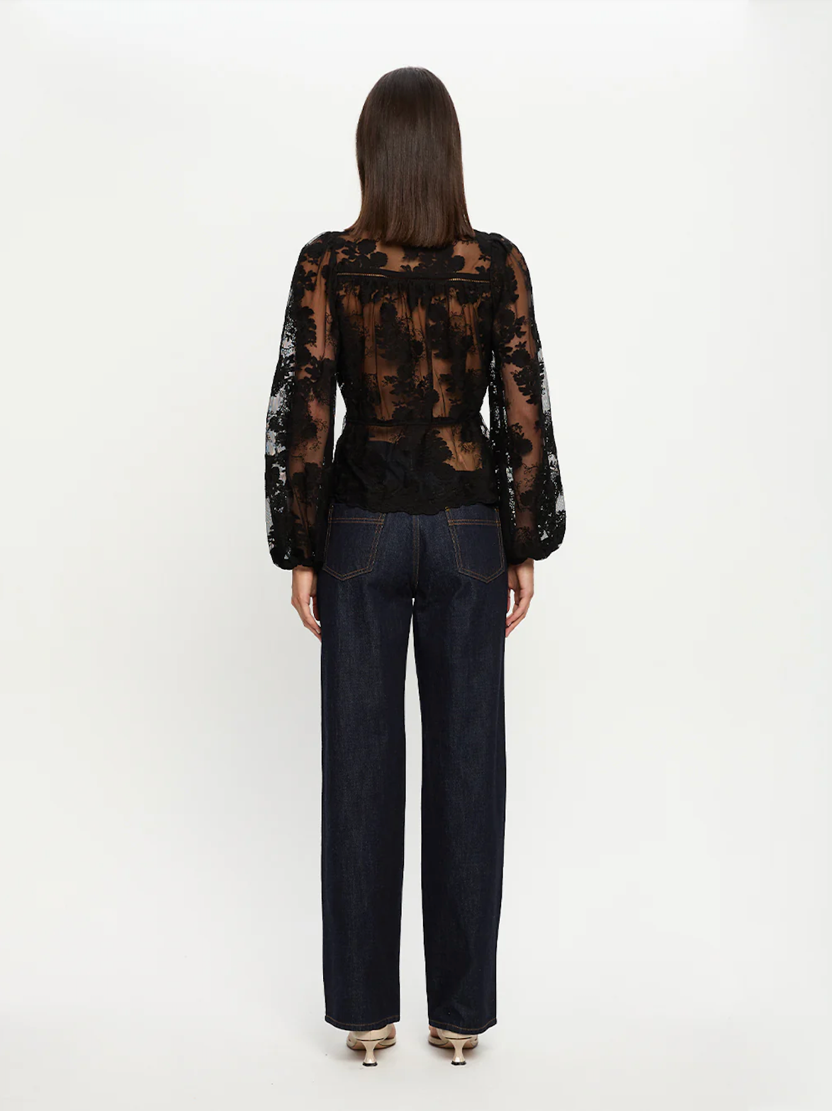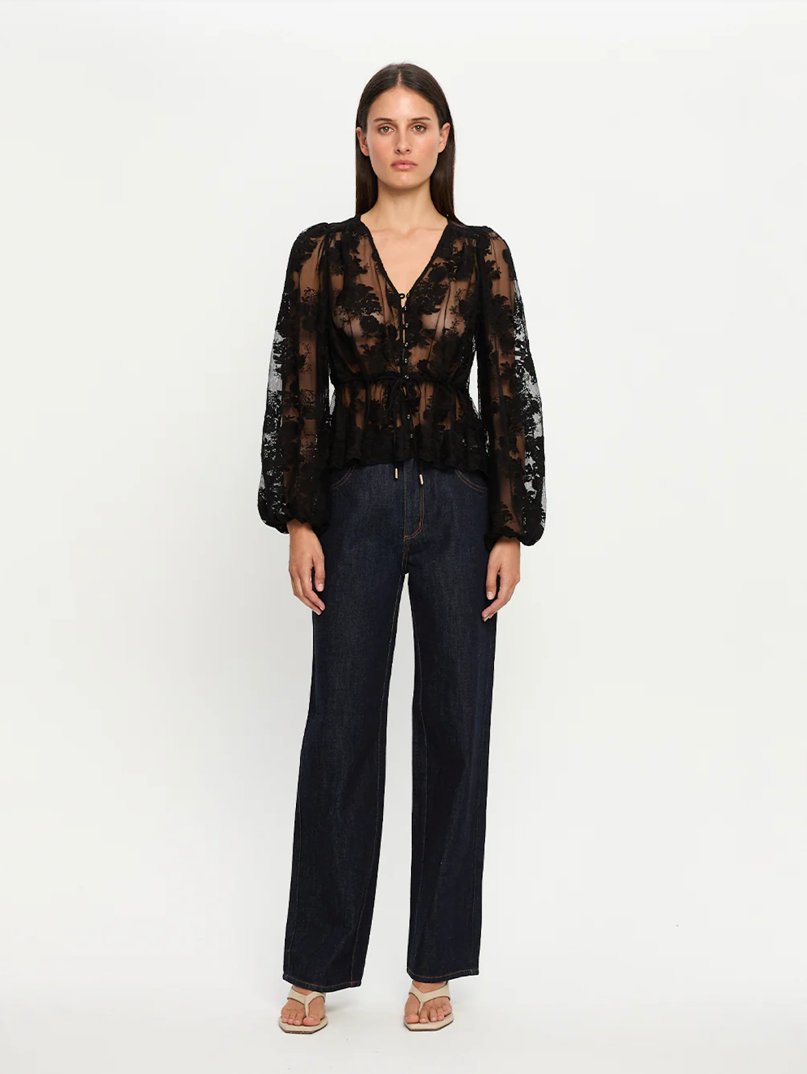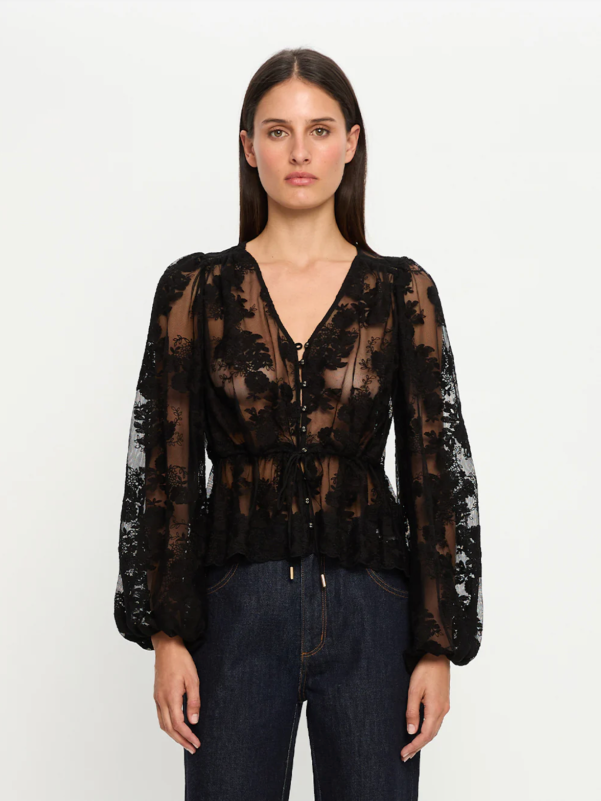 The Blair Lace Top in black is a v-neck sheer lace peplum blouse featuring blouson sleeves and is complete with a drawcord at the waist.