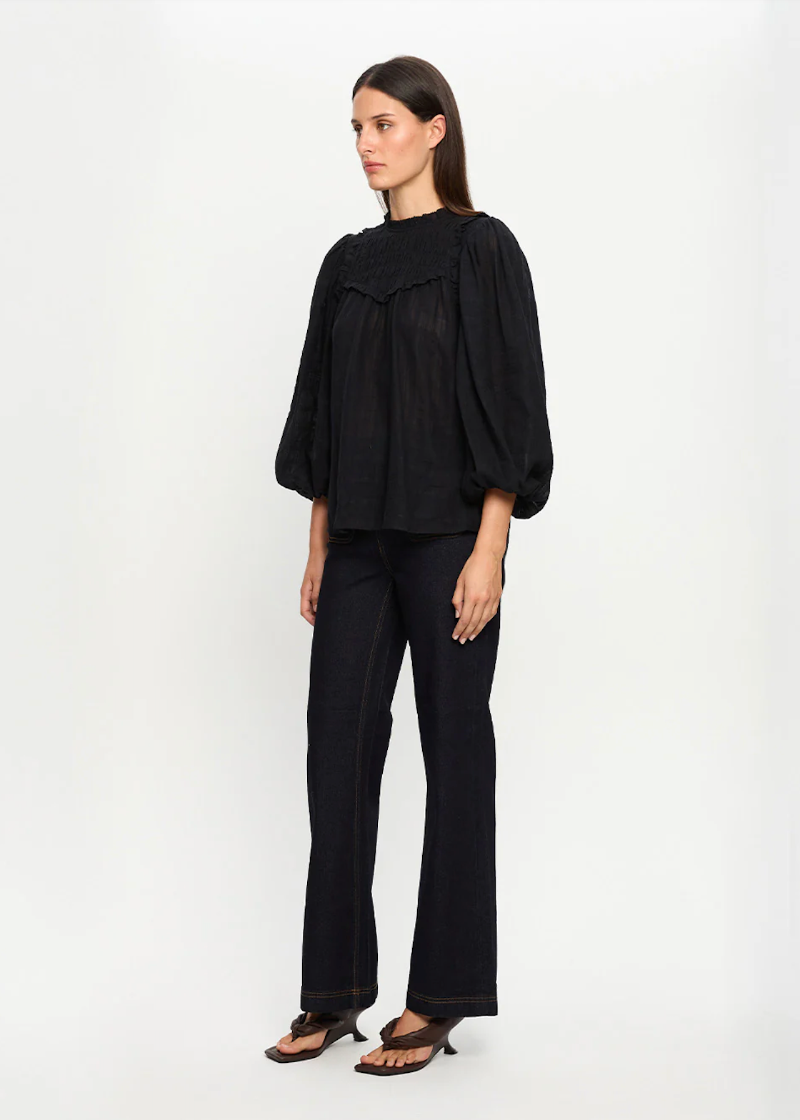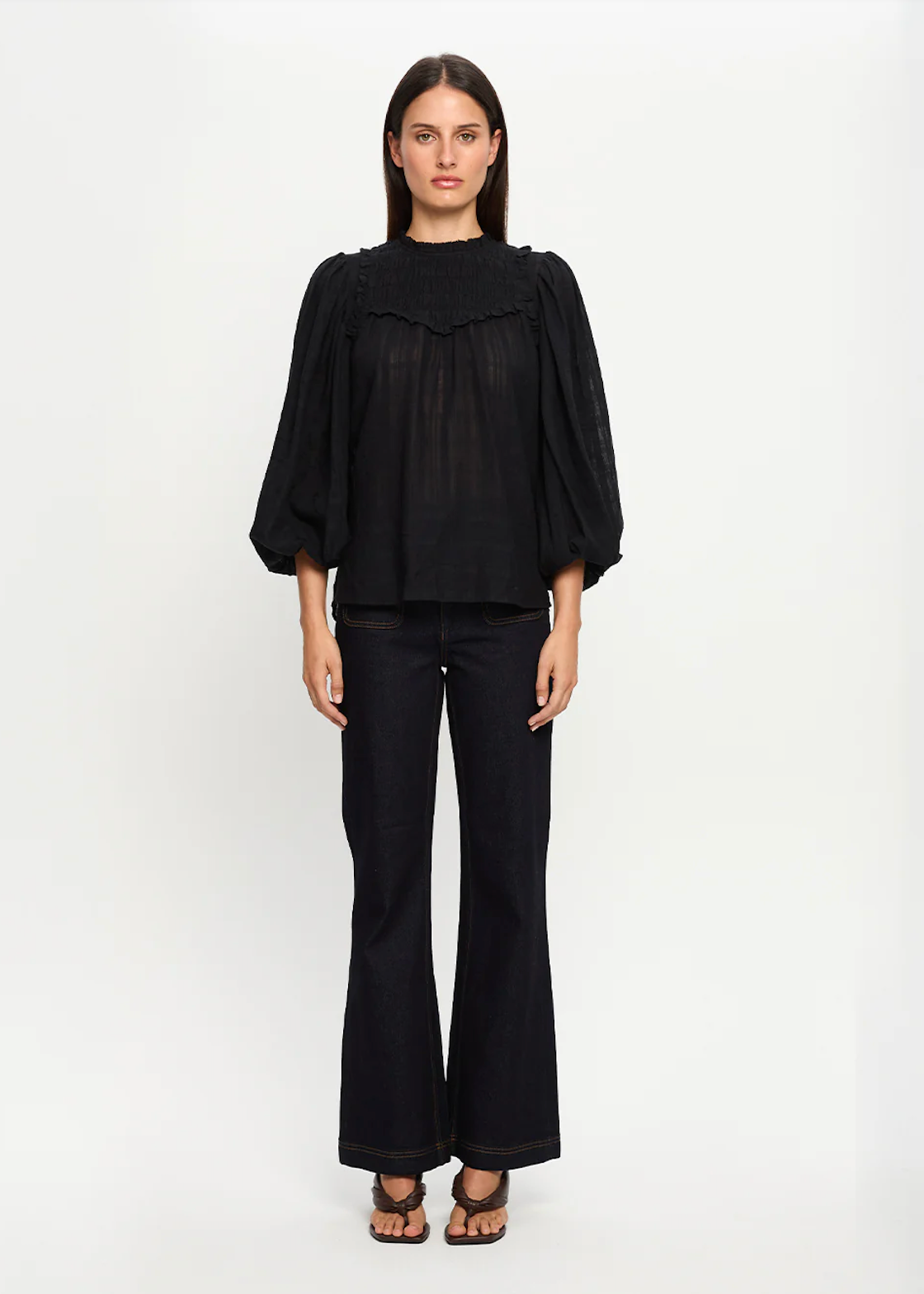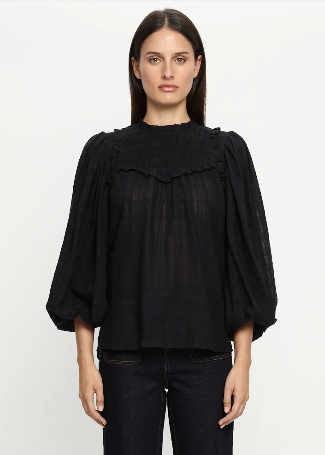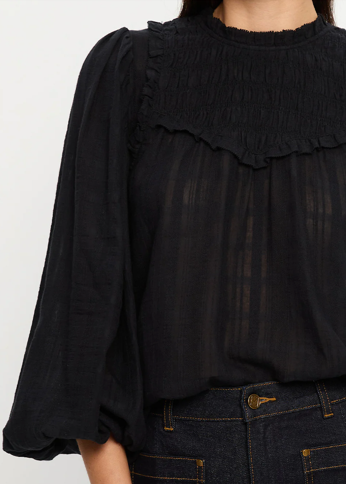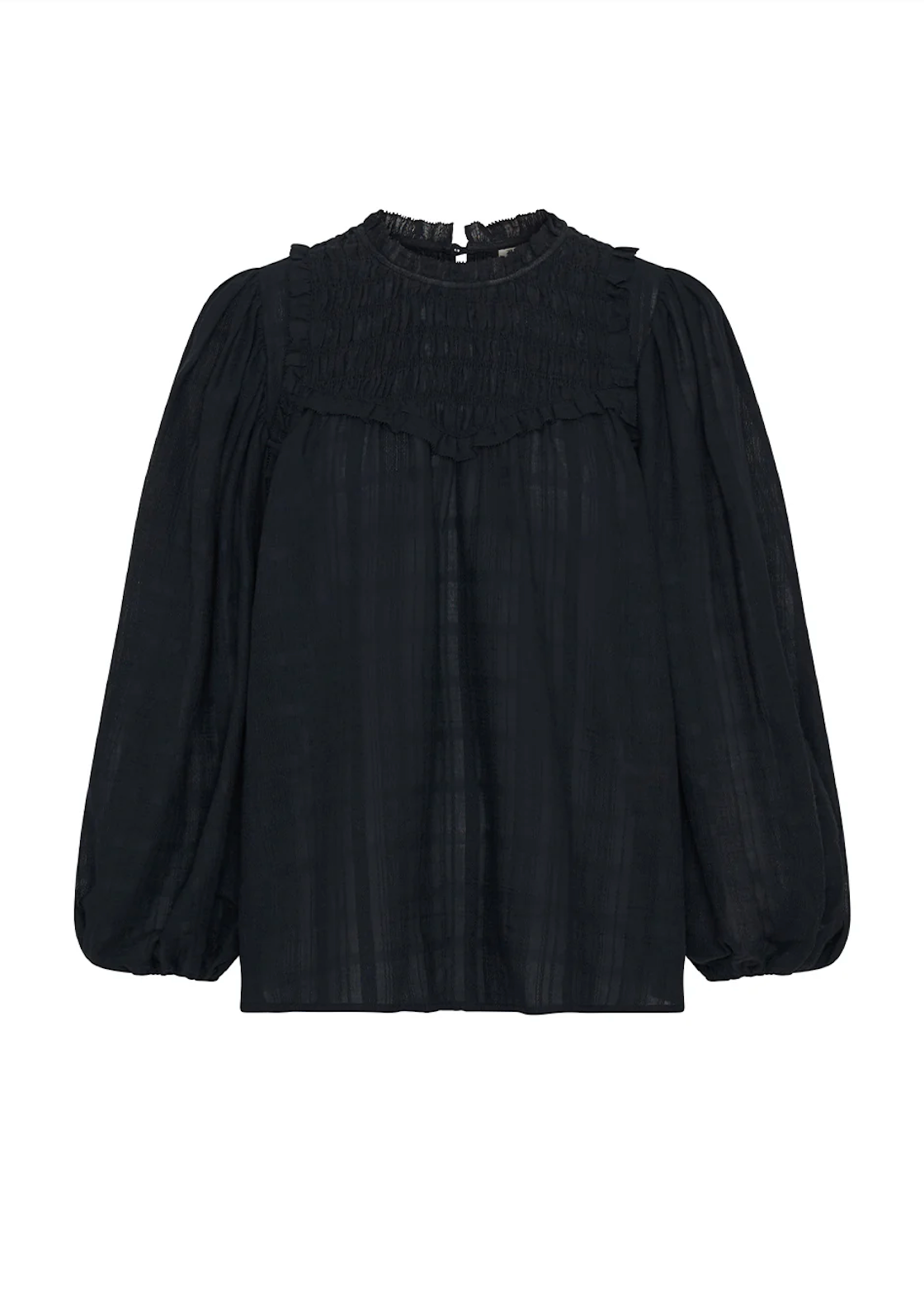 The Paige Blouse in a black semi sheer check fabric features full length sleeves with a shirred yoke complete with ruffle detailing.