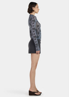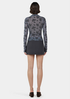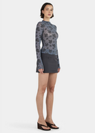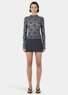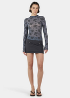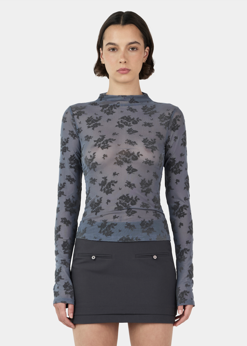 The Deni Skivvy Top is a mock neck long sleeve cut from a sheer fabrication with a flocked applique floral design. Vesatile and lightweight the Deni Skivvy is perfect for layering or wearing on its own.