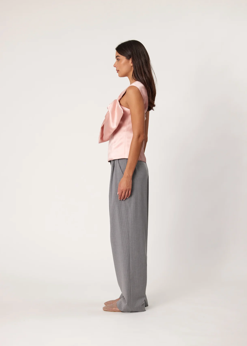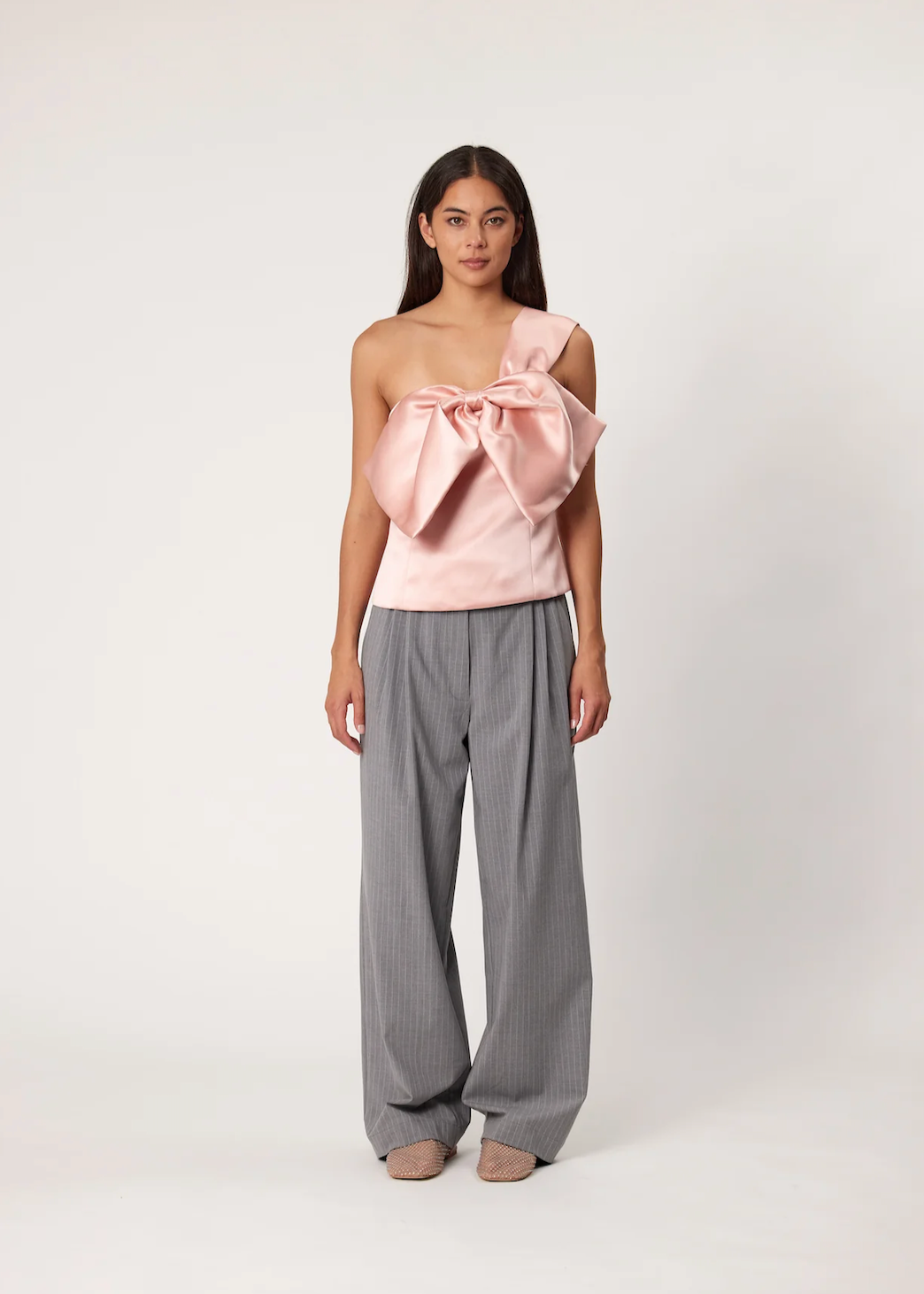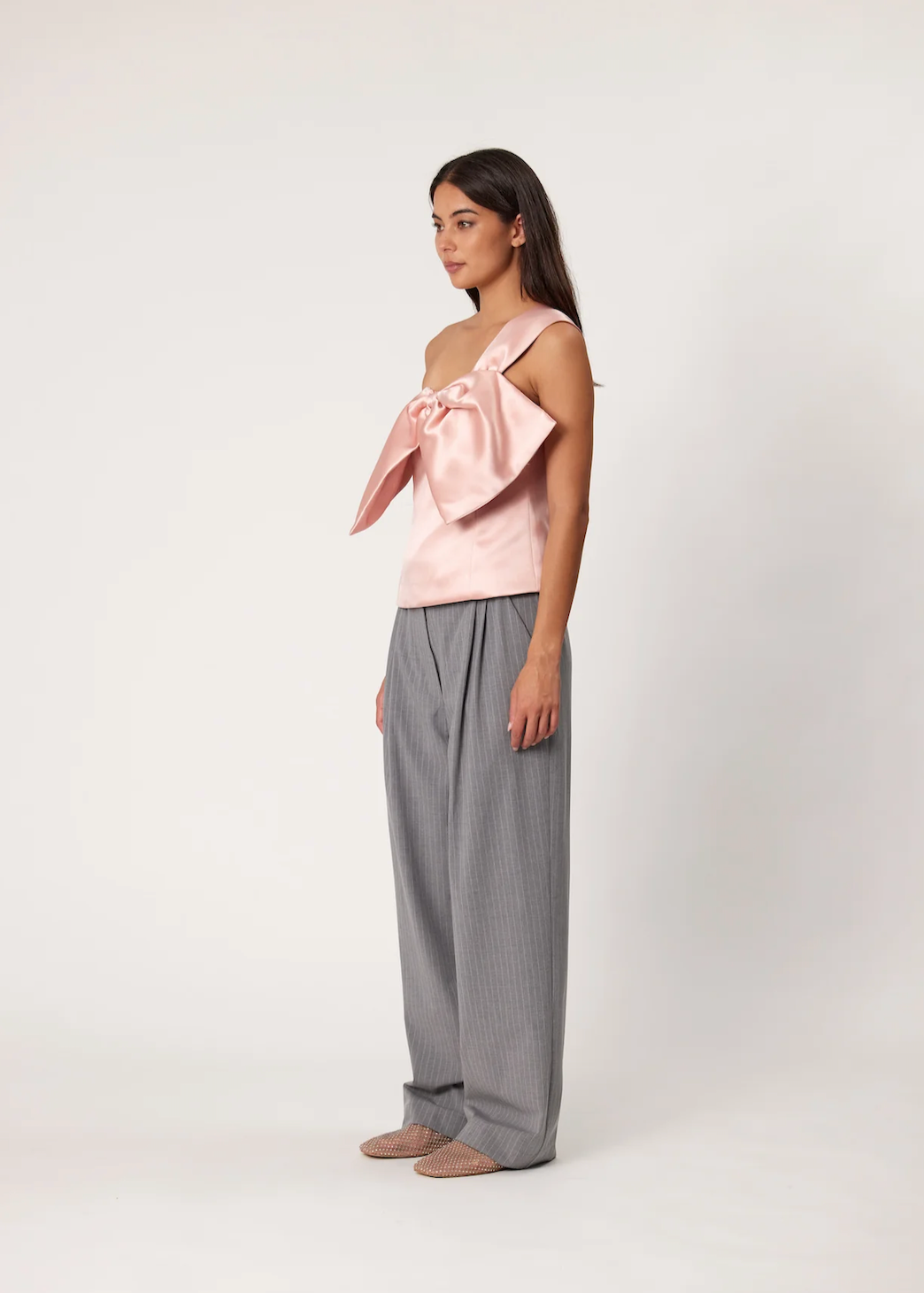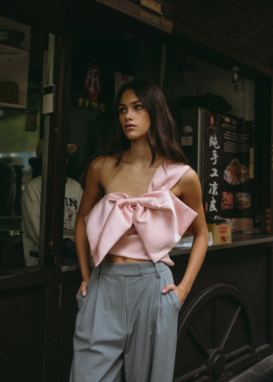 A satin bodice featuring an exaggerated front bow, thick one shoulder strap and hidden back zipper. Be sure to make a statement in the Avery bodice. Also available in a dress length.