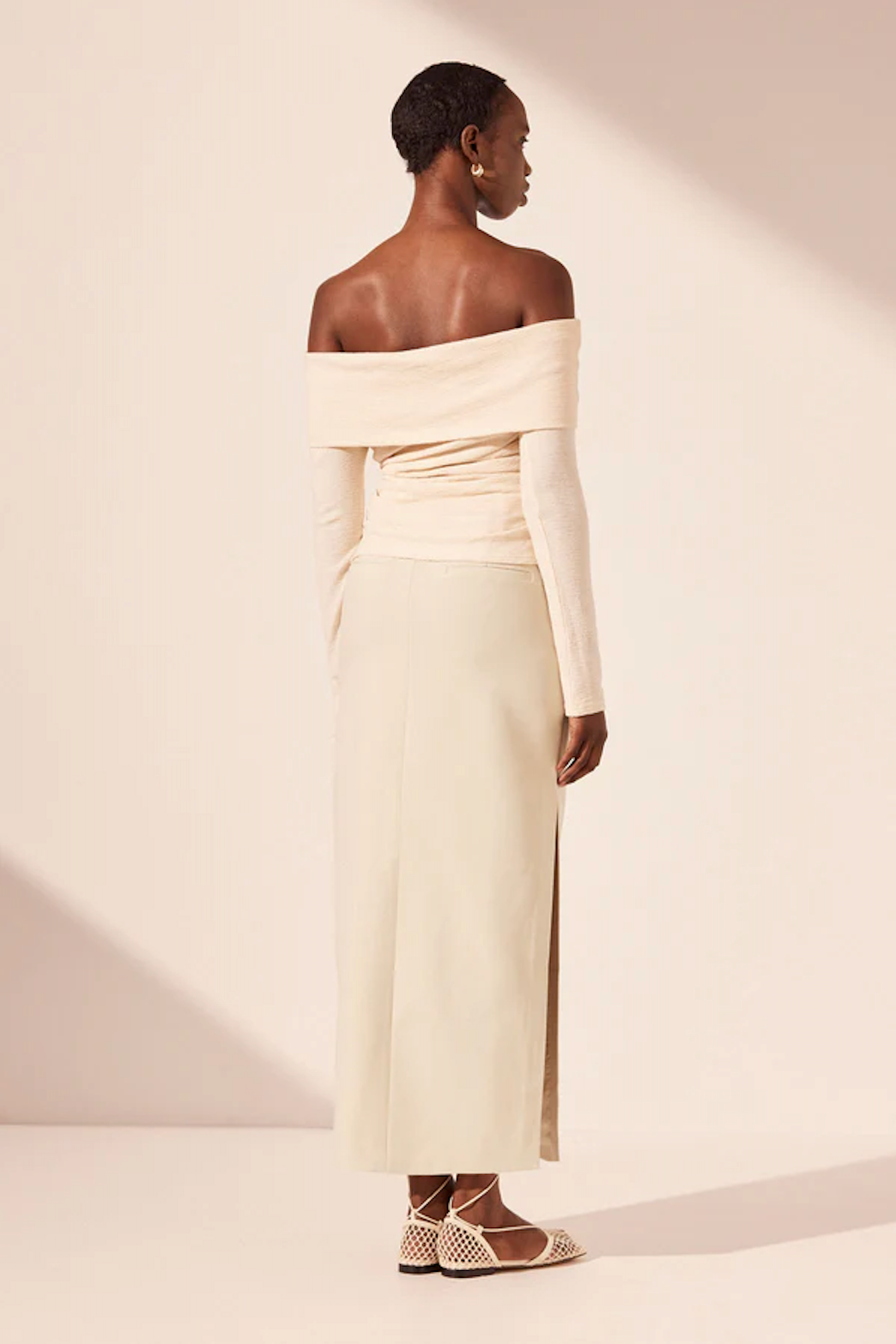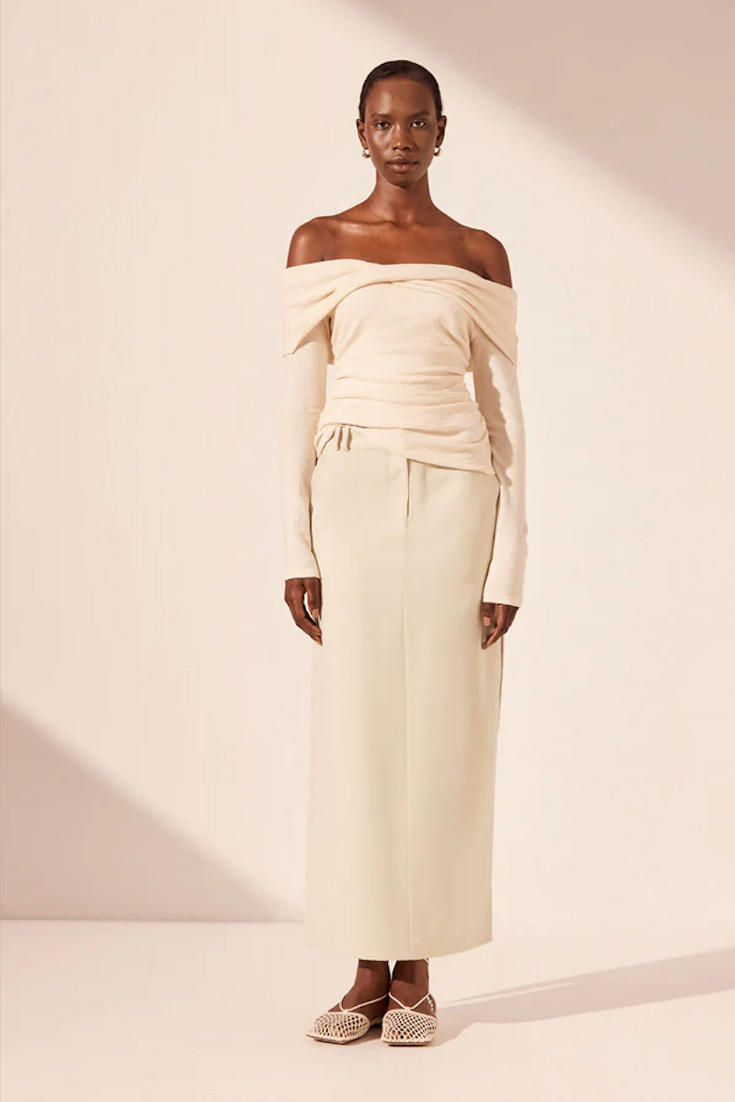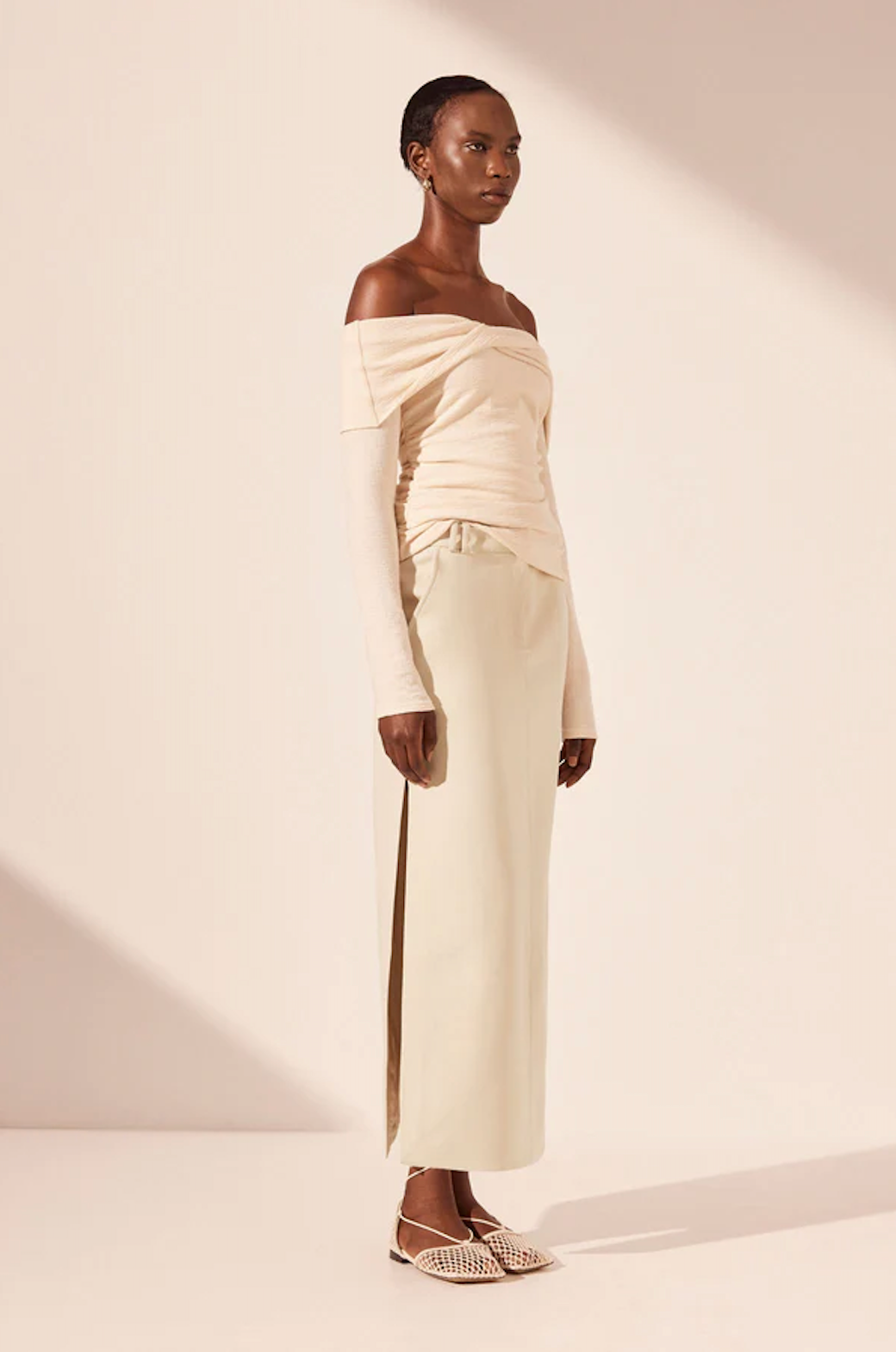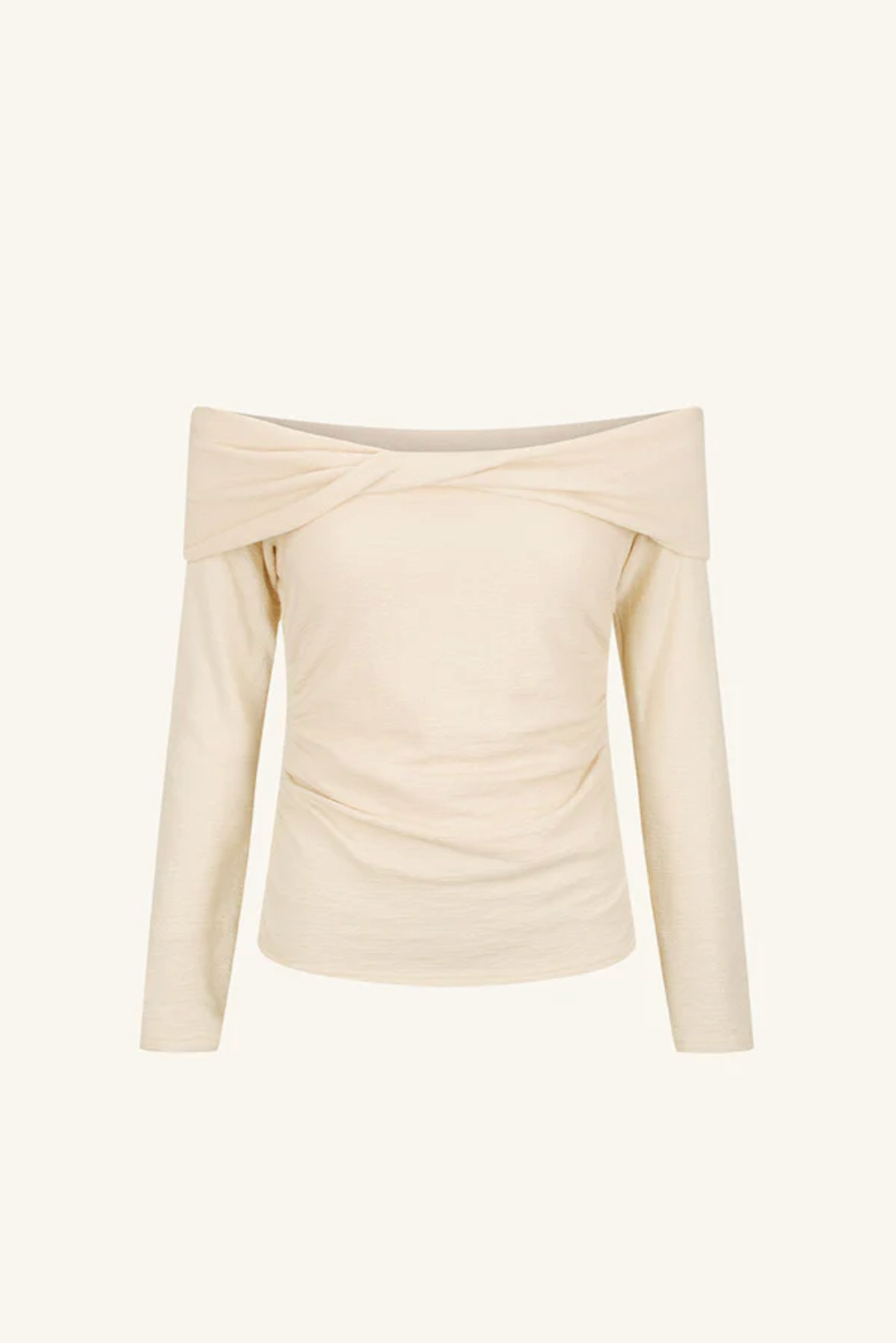 Off shoulder twist front top in macadamia in a soft cotton jacquard.