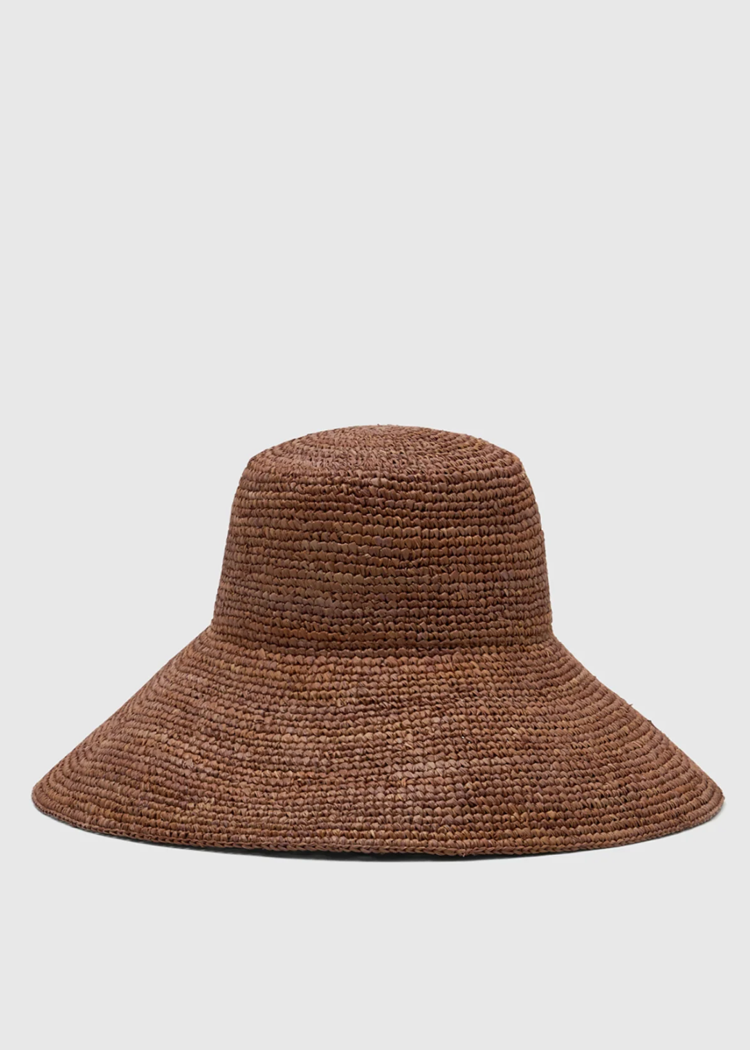 CAMILLA AND MARC Oasis woven wide-brim straw hat in chocolate brown raffia. Monogram logo at centre back.