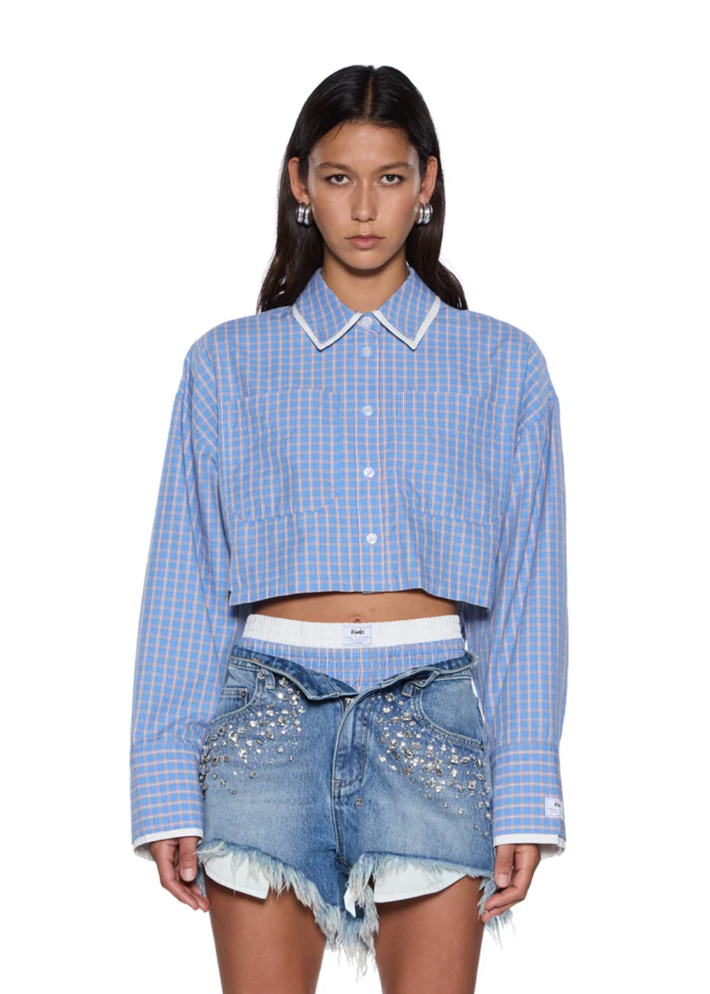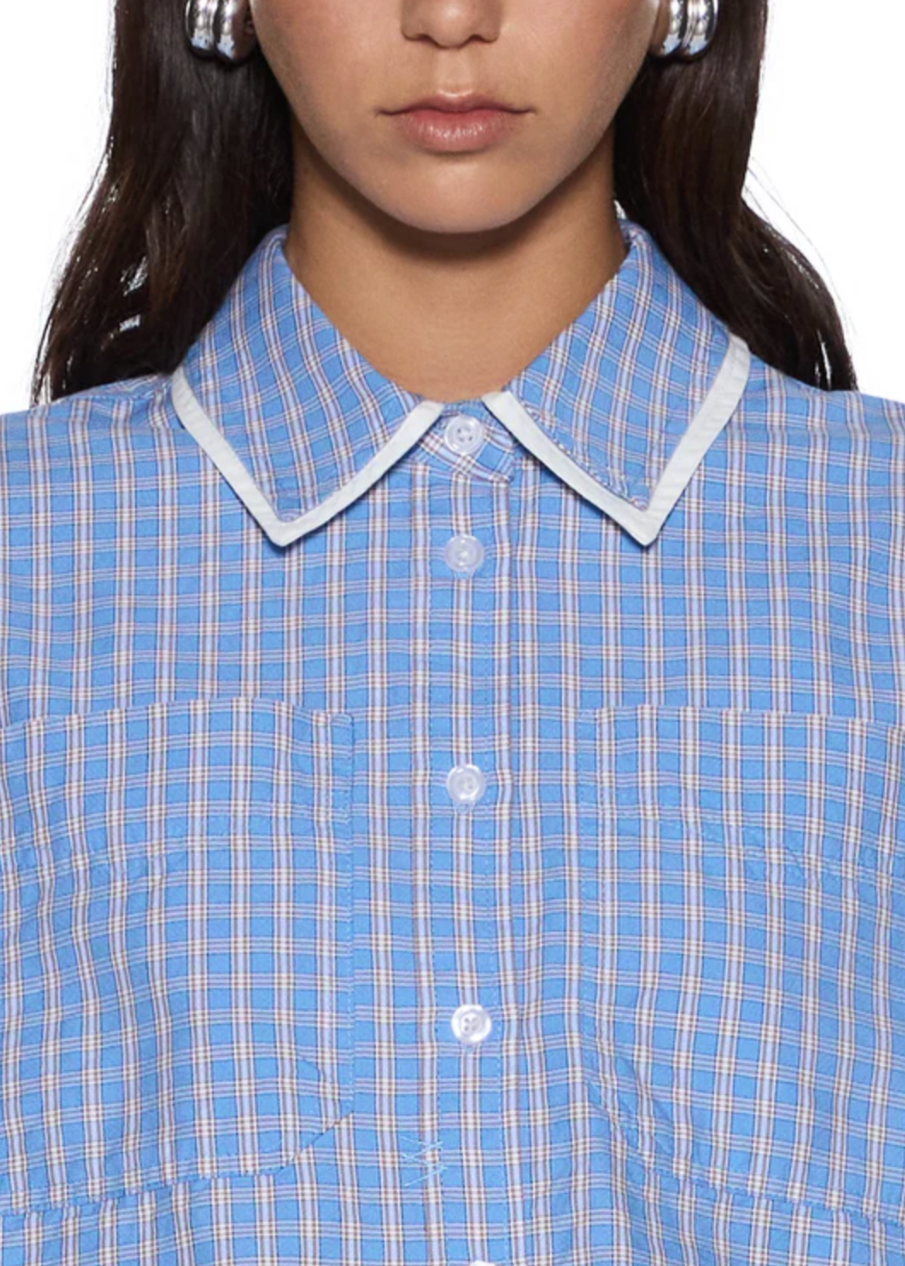 The Balter LS Shirt Blu Check is an oversized button-up shirt crafted from premium 100% cotton in a custom handloom plaid with a seasonal blue check. Designed with a cropped length, contrast double-layer collar and cuffs, panelled twin patch pockets, and exaggerated cuffs, it is finished with a 'Made in Heaven' woven label on the cuff and KsubiÕs signature T-box embroidery for an elevated off-duty look.