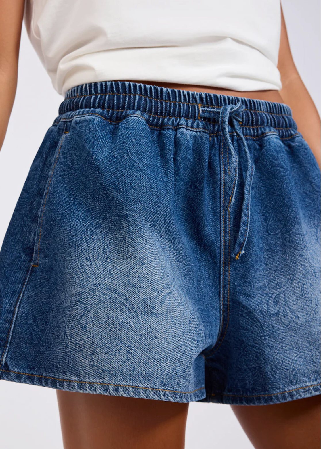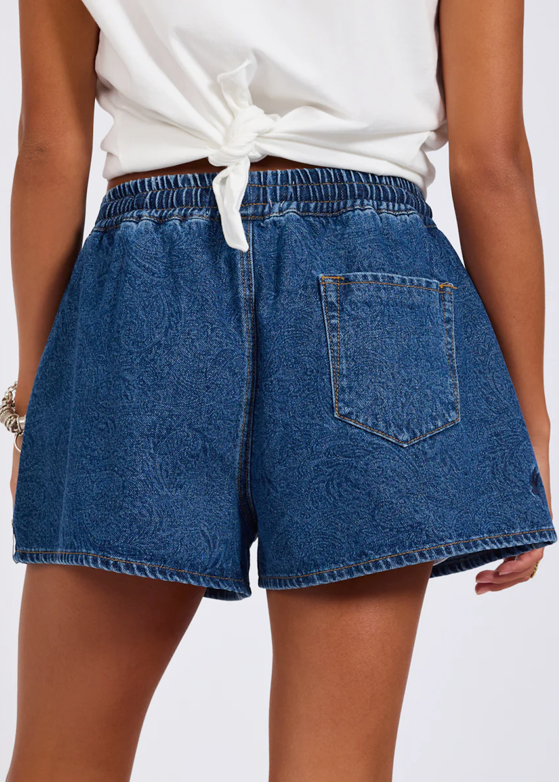 The BLUE PAISLEY BOXER DRAWSTRING WAIST DENIM SHORTS redefine comfort with a One Teaspoon twist — lightweight, relaxed and endlessly wearable.