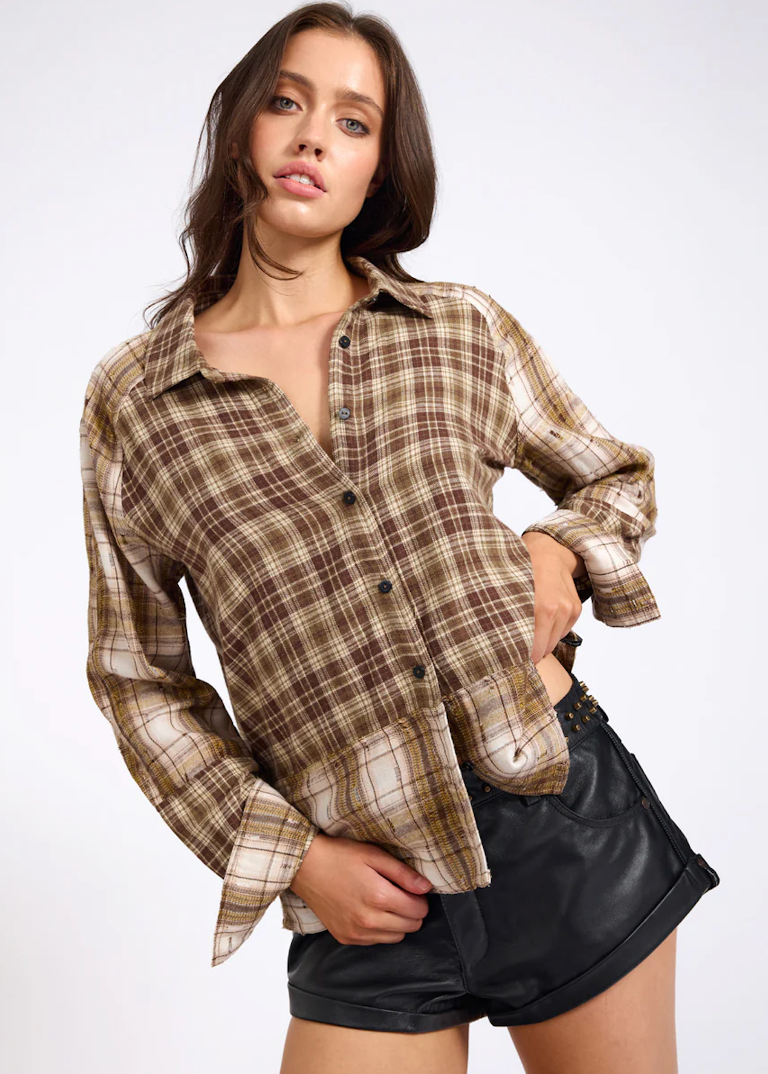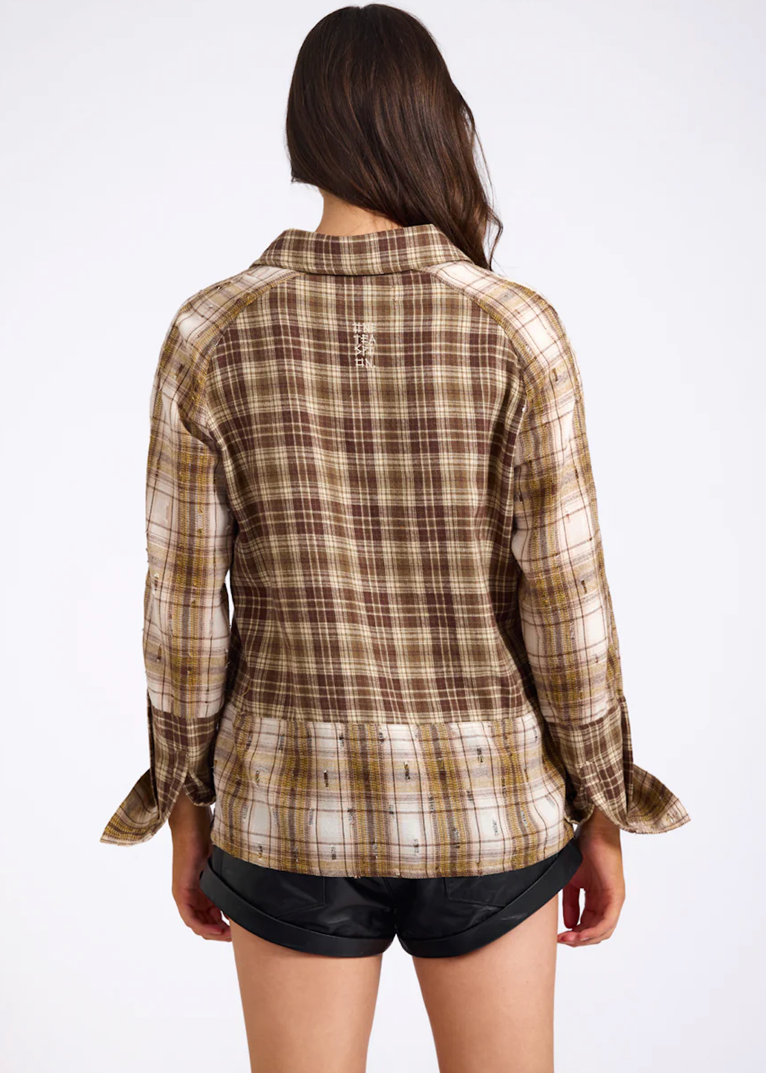The BROWN RODEO RUST PATCHWORK FLANNEL SHIRT celebrates vintage Americana. Crafted from mixed flannel panels in rust and brown tones, cut oversized for that borrowed-from-the-boys fit.