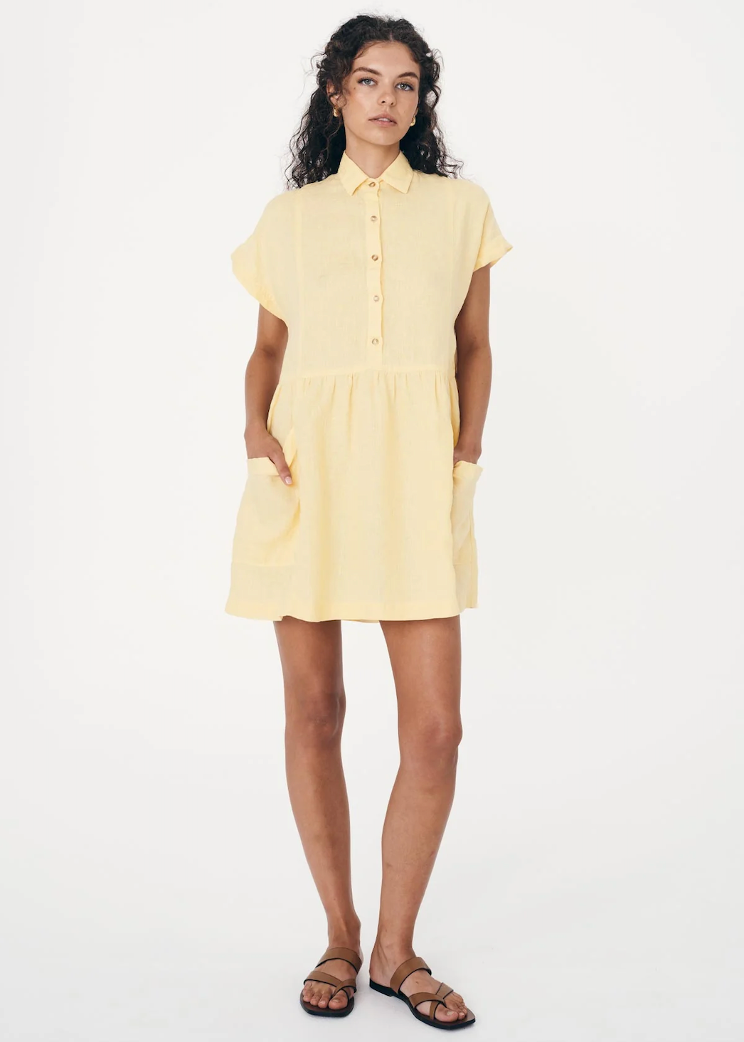Cut from French linen in Lemon, the Gina Mini Dress balances ease and utility. A button-through style with angled patch pockets and a boxy, relaxed fit.