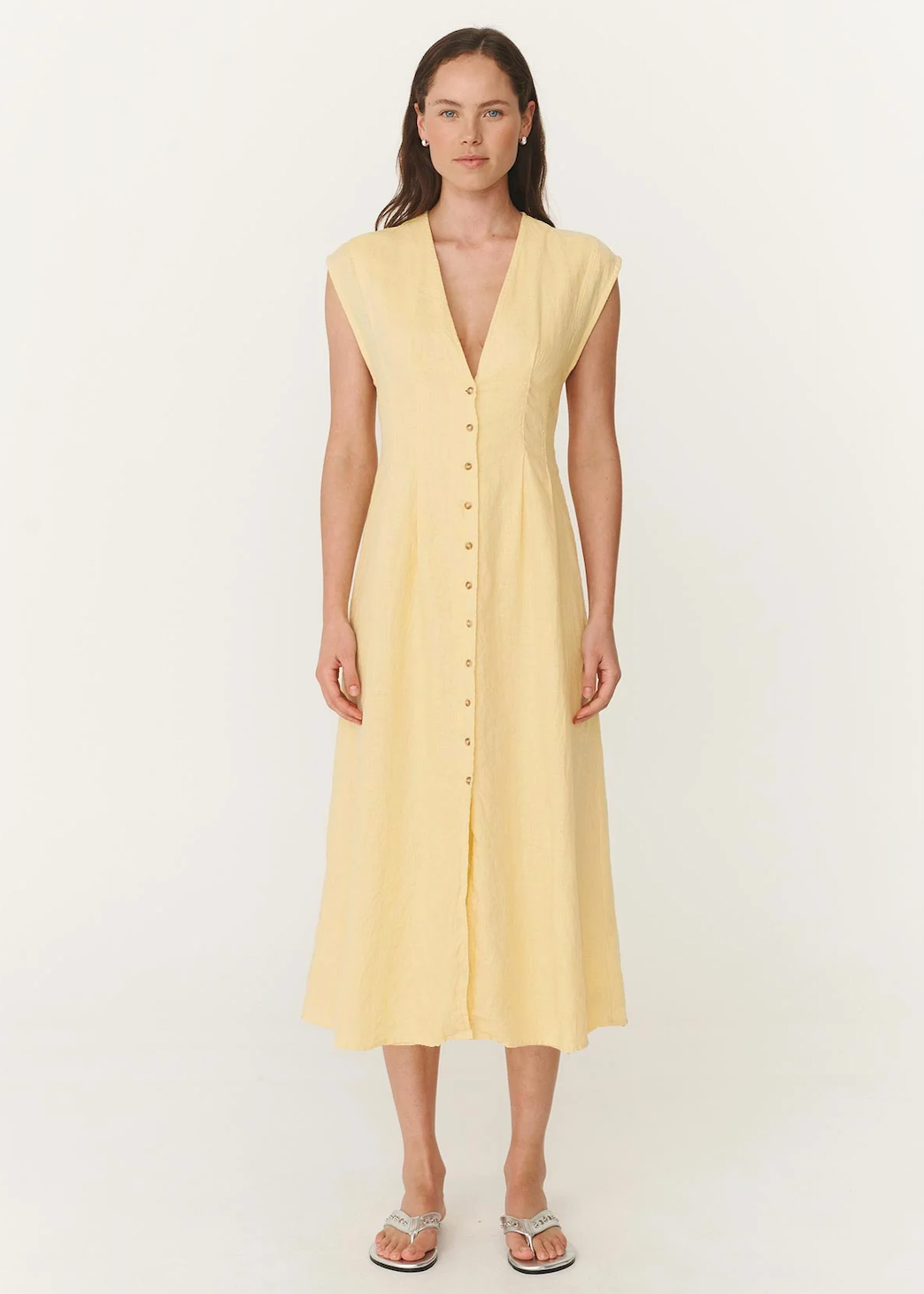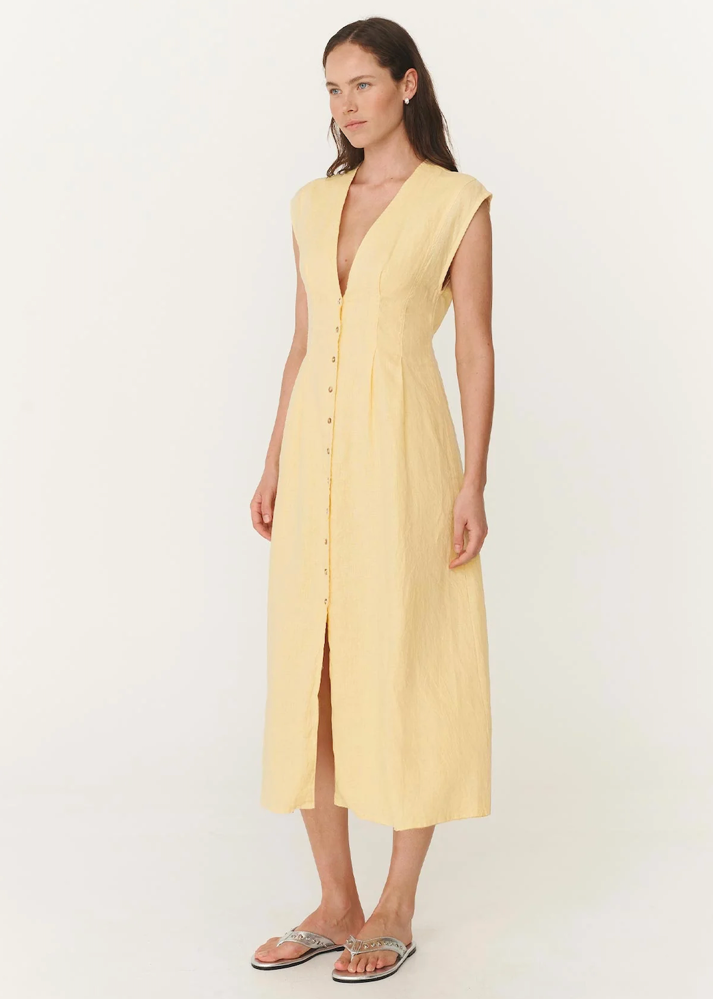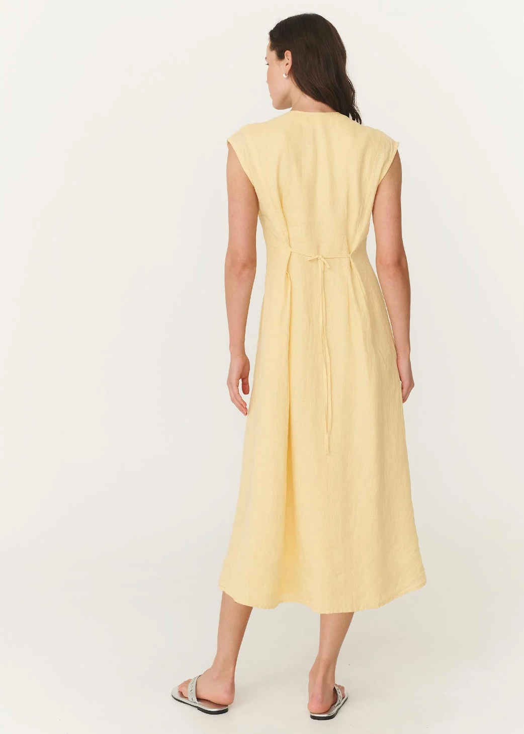 The Mira Dress in Lemon is defined by its plunging neckline and button-through front. A linen midi with darted waist, tie-back detail, and full lining for structure that moves.