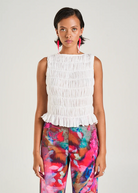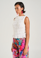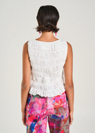 The Shirred Tank in Sheer White is made from a cotton blend featuring a textured, crinkled effect. It offers a traditional tank shape, elevated by the shirred finish and flared fringed hem that accentuates the feminine form.