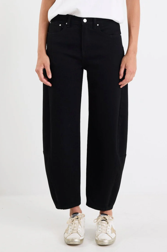 Barrel jeans, with their cropped silhouette and tapered ankle, are especially suited to petite frames. If you’re after a longer length and a more exaggerated barrel shape, we recommend sizing up.