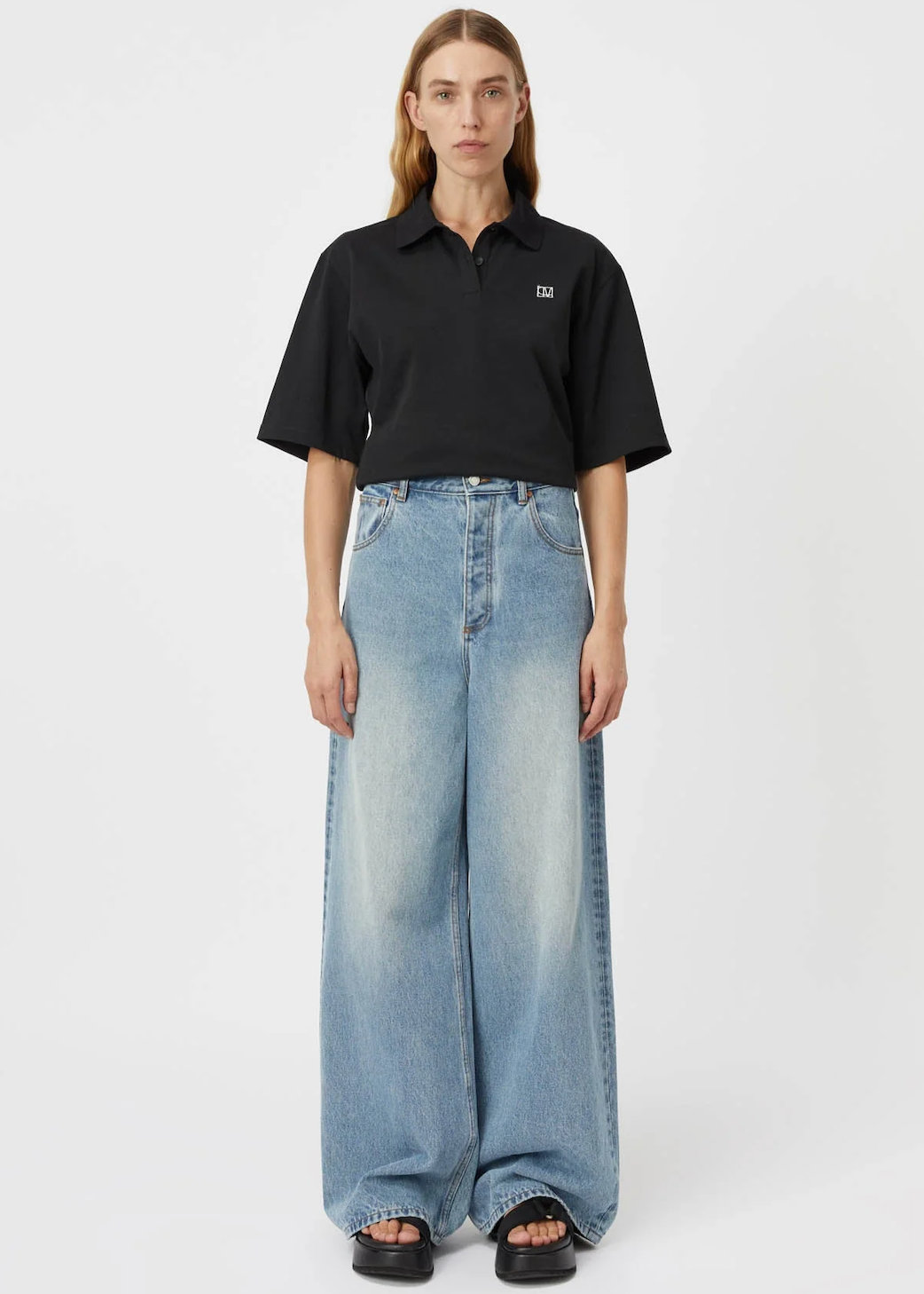 The Adrian Denim Jean is a modern take on classic denim, featuring a light wash blue hue and a flattering high-waisted, wide-leg silhouette. The fly opening is accented with an embossed logo metal button, adding a subtle yet distinctive detail. These jeans offer a perfect blend of style and comfort, making them a versatile staple for any wardrobe.