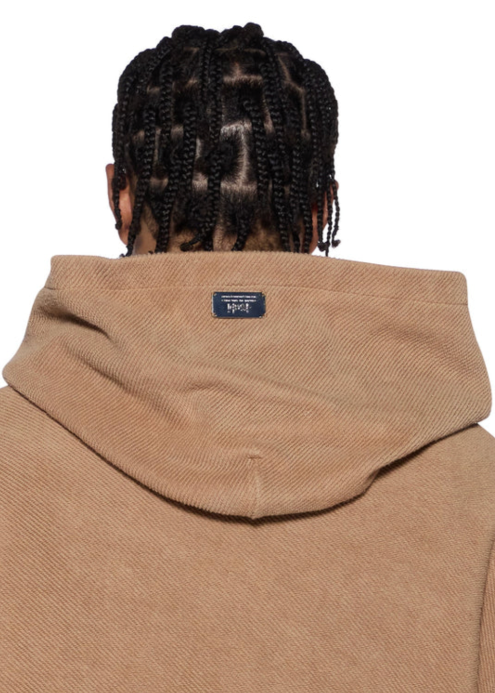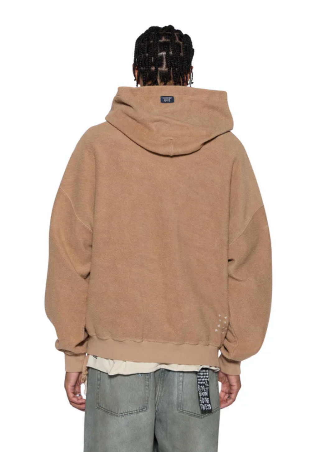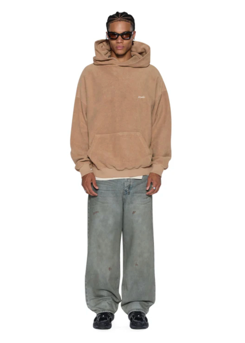 The 1999 Ekcess Hoodie Elk is a boxy oversized fit hoodie featuring a single piece hood, front pouch pocket, and signature rats tail. Made from heavyweight inverted loopback fleece in Elk, it includes seasonal front embroidery, metal hood plate, and tonal T-box and 4x4 embroidery