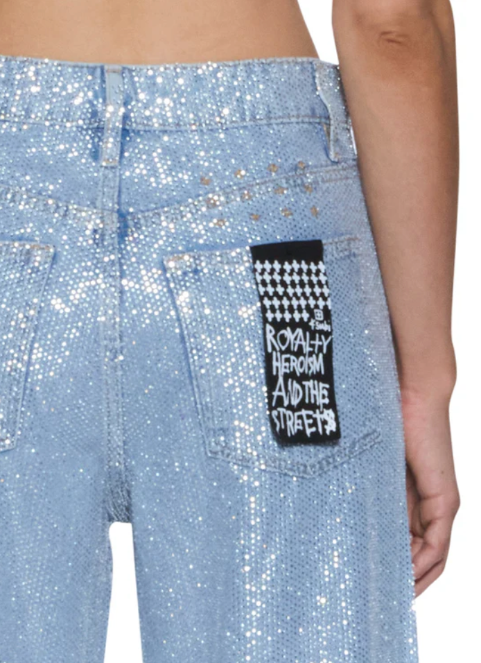The Empire Jean High Rollers is a relaxed straight-leg, full-length jean with a true mid-rise. Made from premium European rigid denim in light blue with an enzyme-soft wash, it is densely embellished with all-over diamante hotfix crystals and features classic five-pocket styling, anti-silver branded hardware, T-box and 3x4 embroidery, and a removable pocket tag on the wearer's right back pocket.