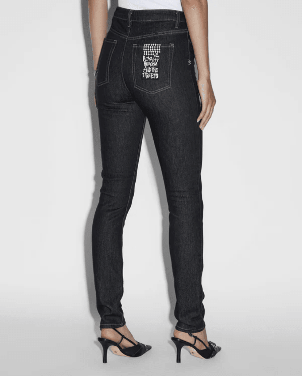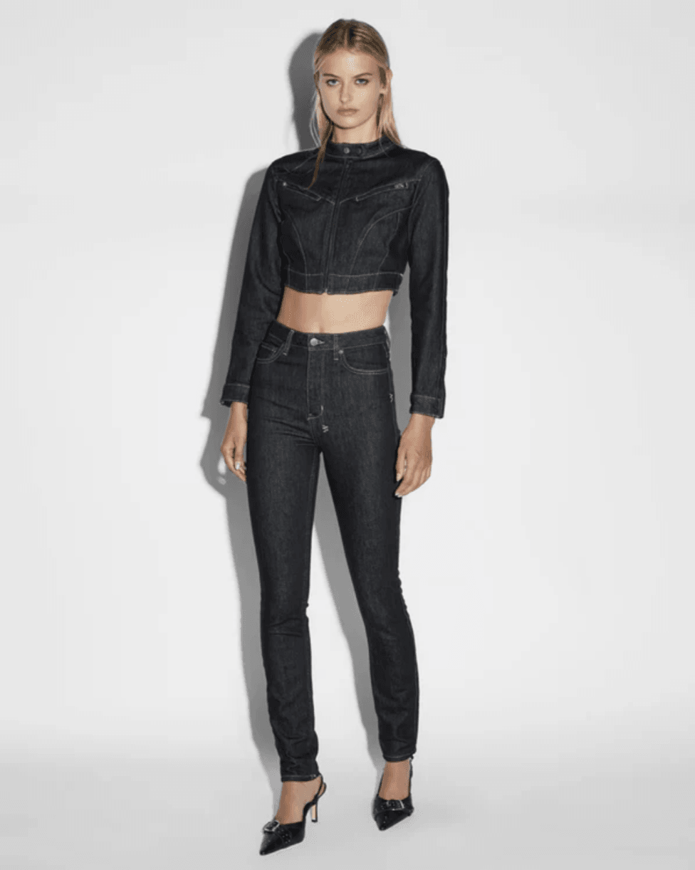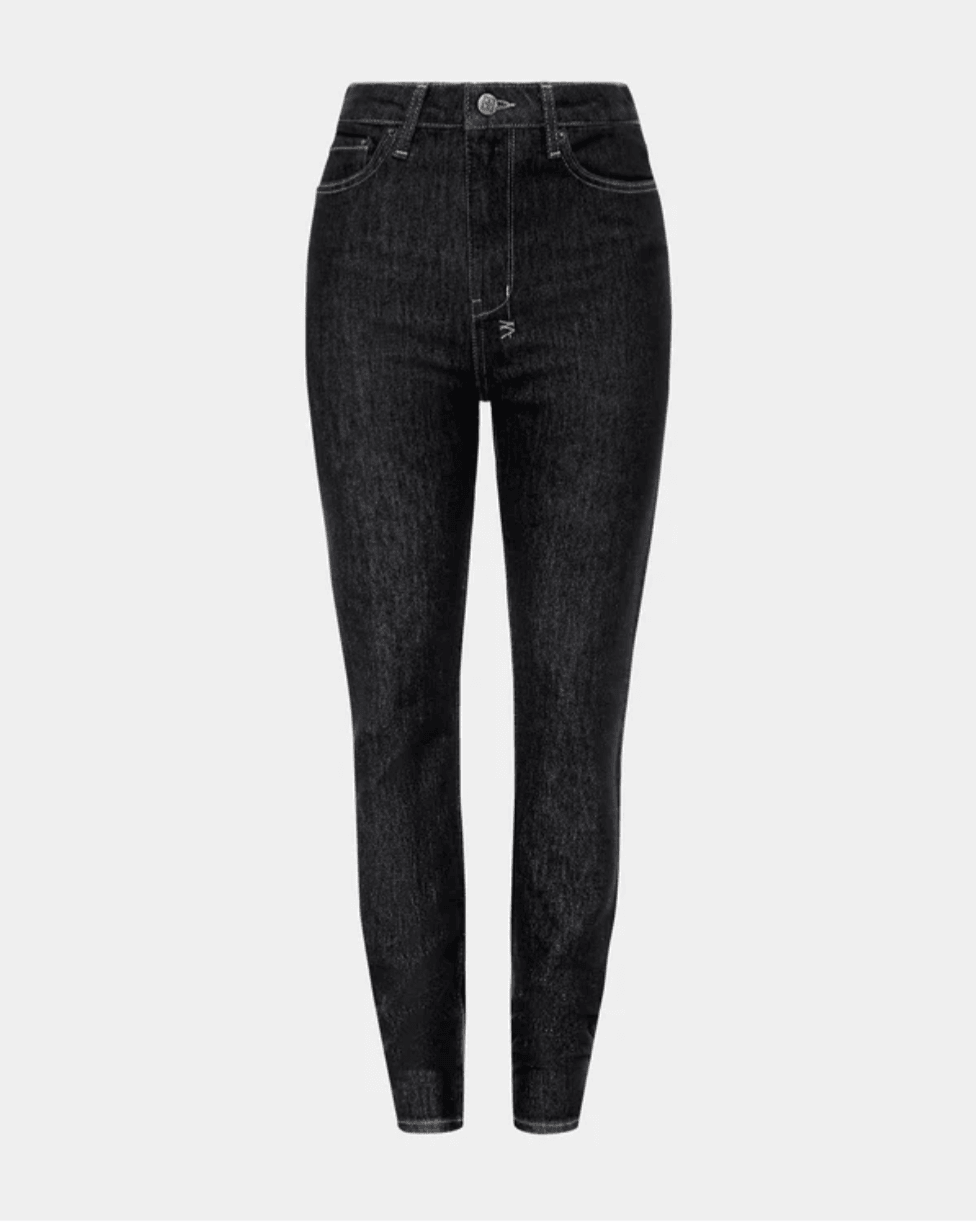 The Hi N Wasted Xtra Midnight is a super high rise, skinny jean made from European power stretch denim. This black jean is detailed with a light grey topstitch, branded hardware and 3x4 embrodiery. The pocket tag on wearer's right back pocket is removable. Style back with a boyfriend fit Oh G tee for an effortless off-duty fit.