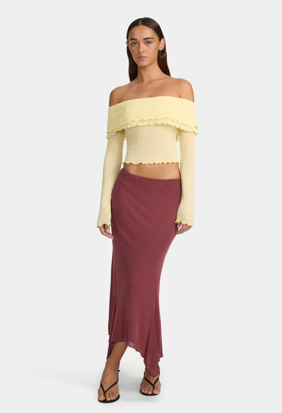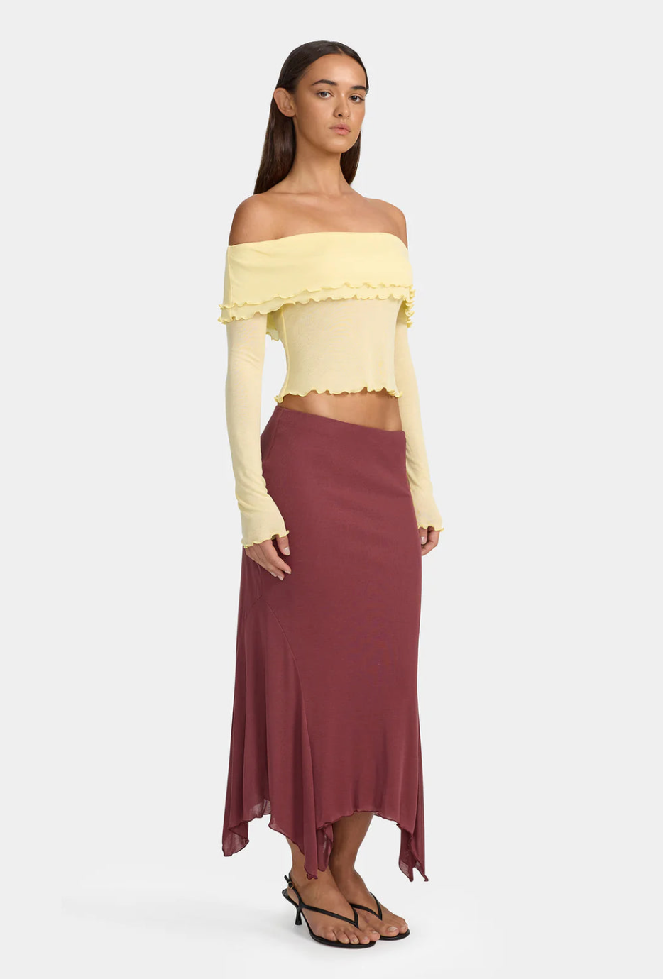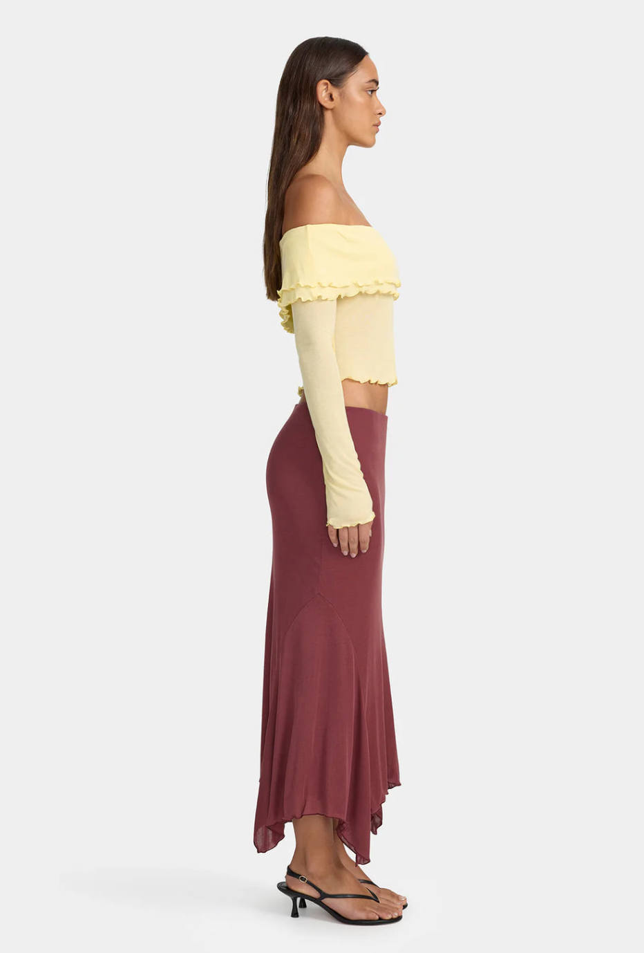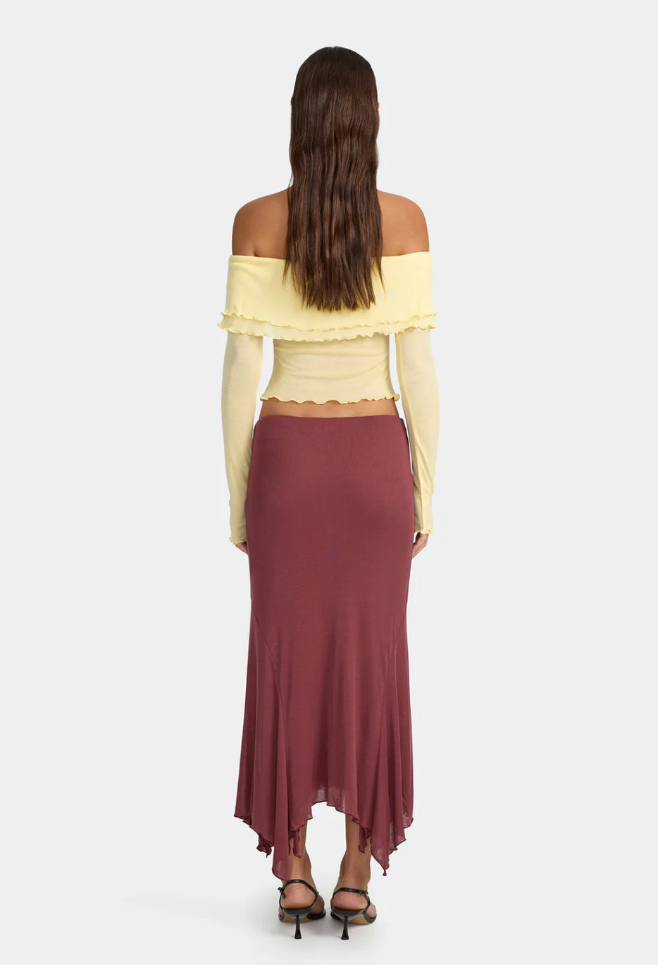 The Kimmy Skirt is an asymmetrical midi skirt made from a super soft jersey material. The skirt can be worn high or low waisted, making it the perfect skirt to pair with any top.