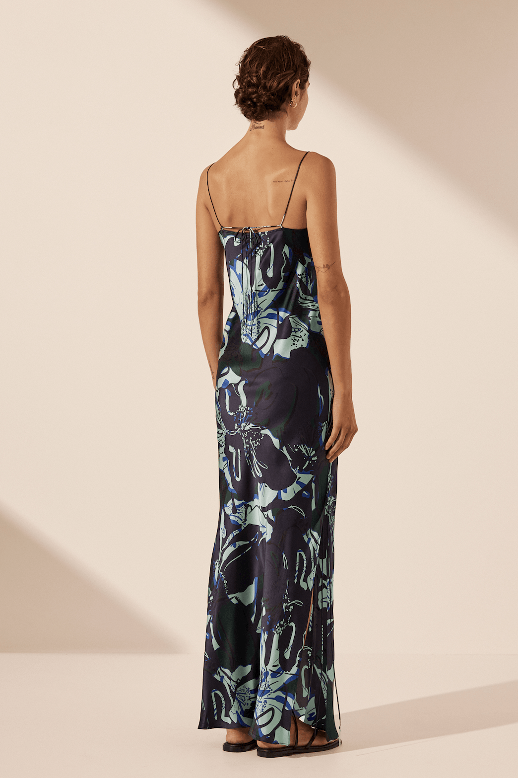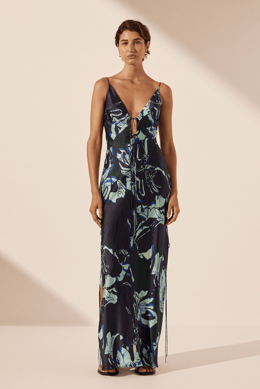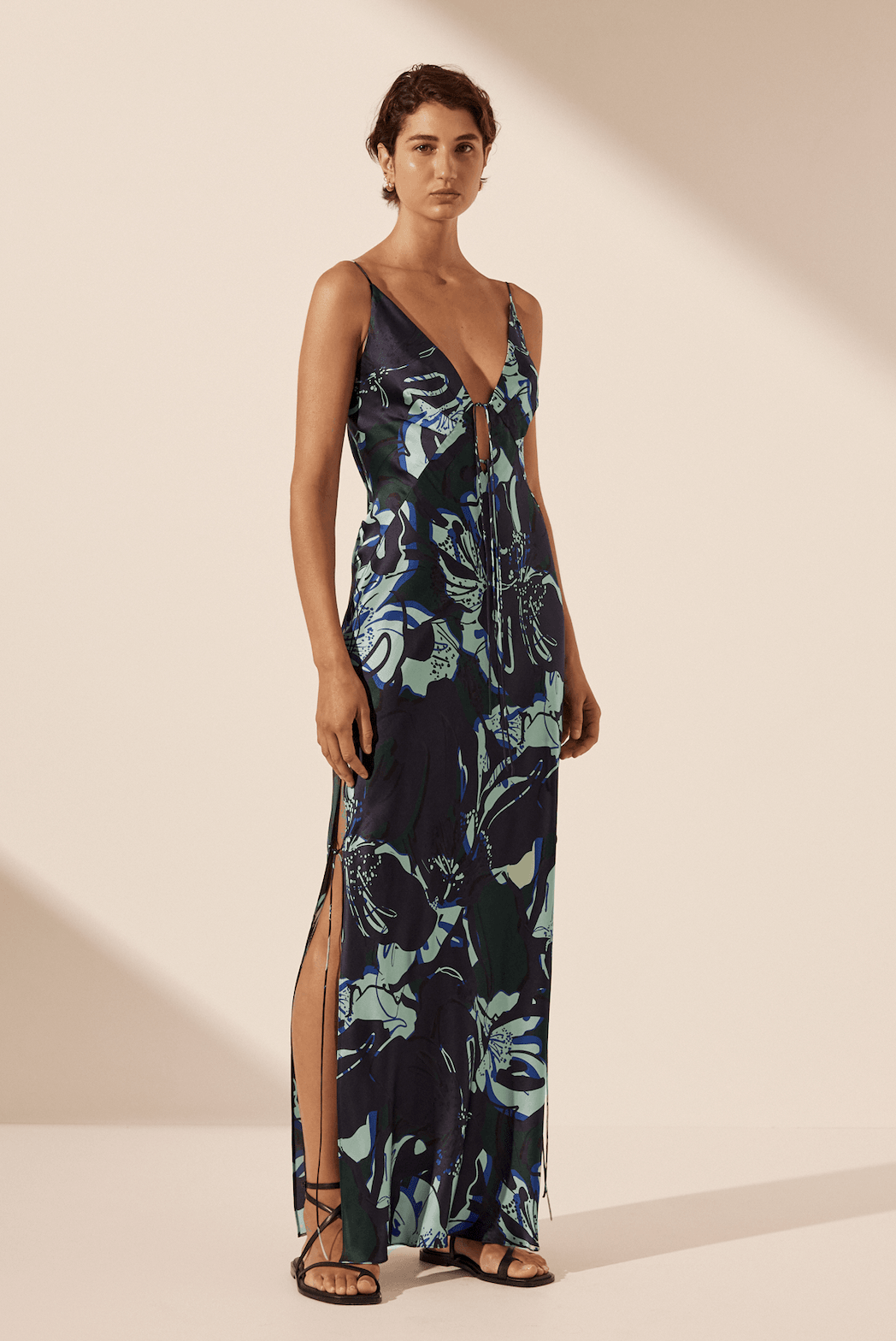 SHONA JOY Franco Silk Plunged Slip Tie Maxi Dress - Navy/Floral