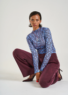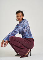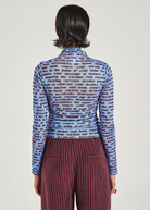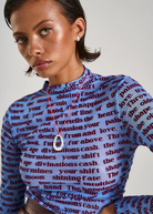 The LS Ruched High Neck Top in a vibrant lotus blue has been rendered in mesh and features Summi Summi's Fortune Teller poem as raised velvet text.